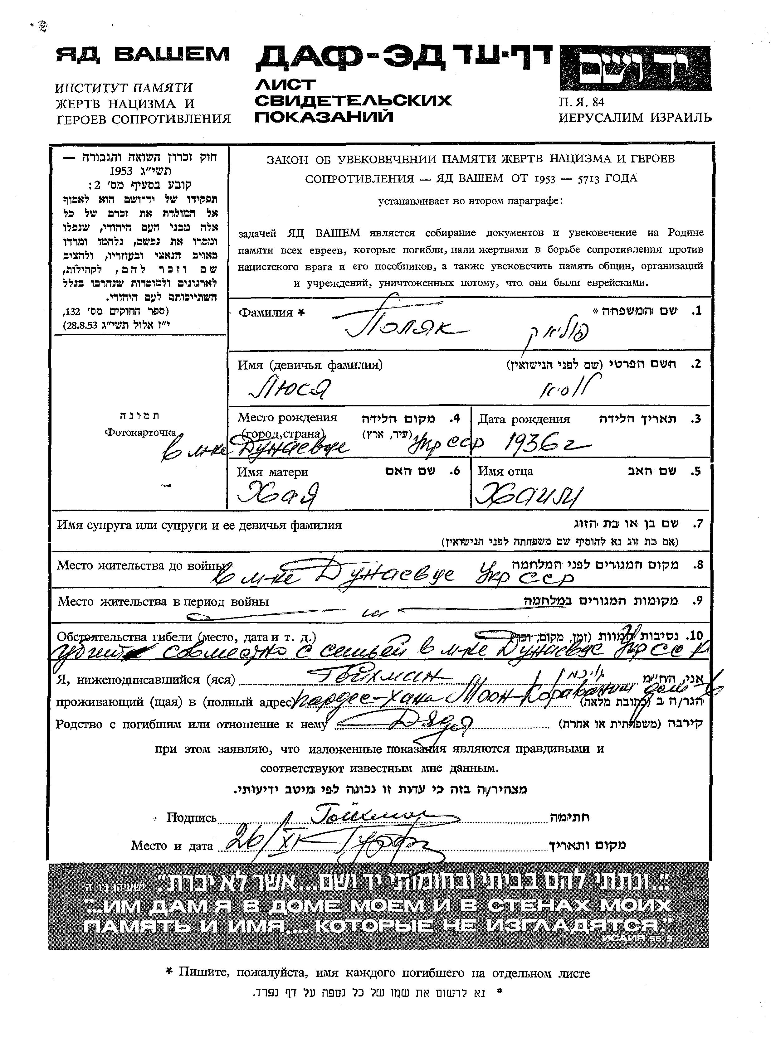 Lyusia Polack wurde im Jahr 1936 in Dunayevtsy, Ukraine (UdSSR) geboren. Vor dem Zweiten Weltkrieg lebte sie in Dunayevtsy, Ukraine (UdSSR).