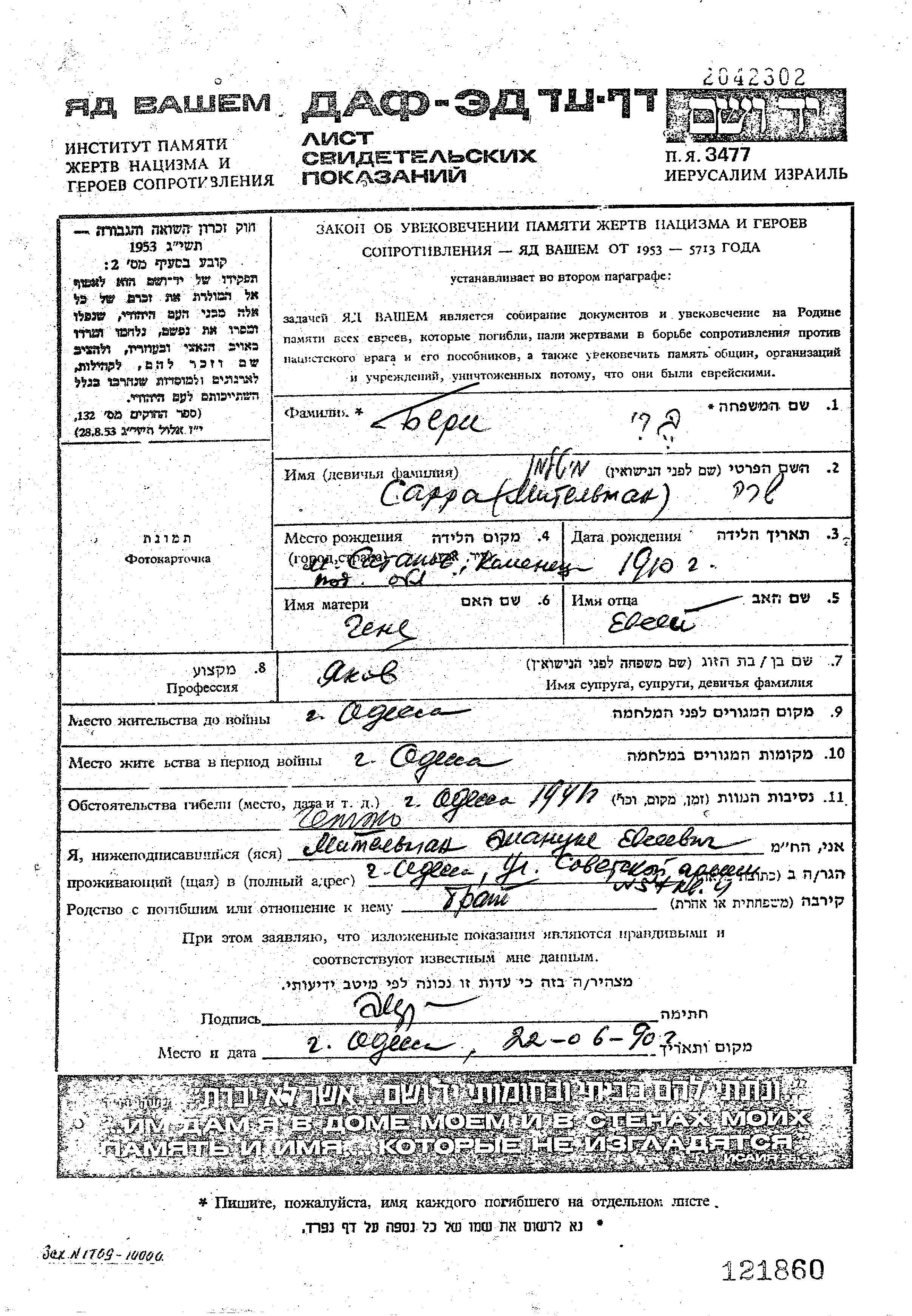 Beri Sara 1910 Odessa, Ukraine (UdSSR) Gedenkblatt