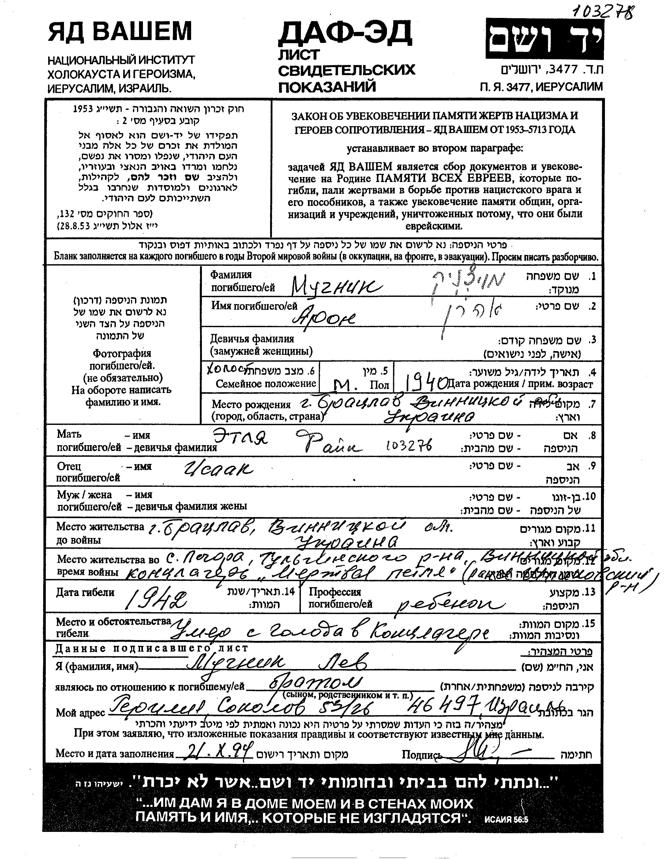 Muchnik Aron 1940 Bratslav, Ukraine (UdSSR) Gedenkblatt