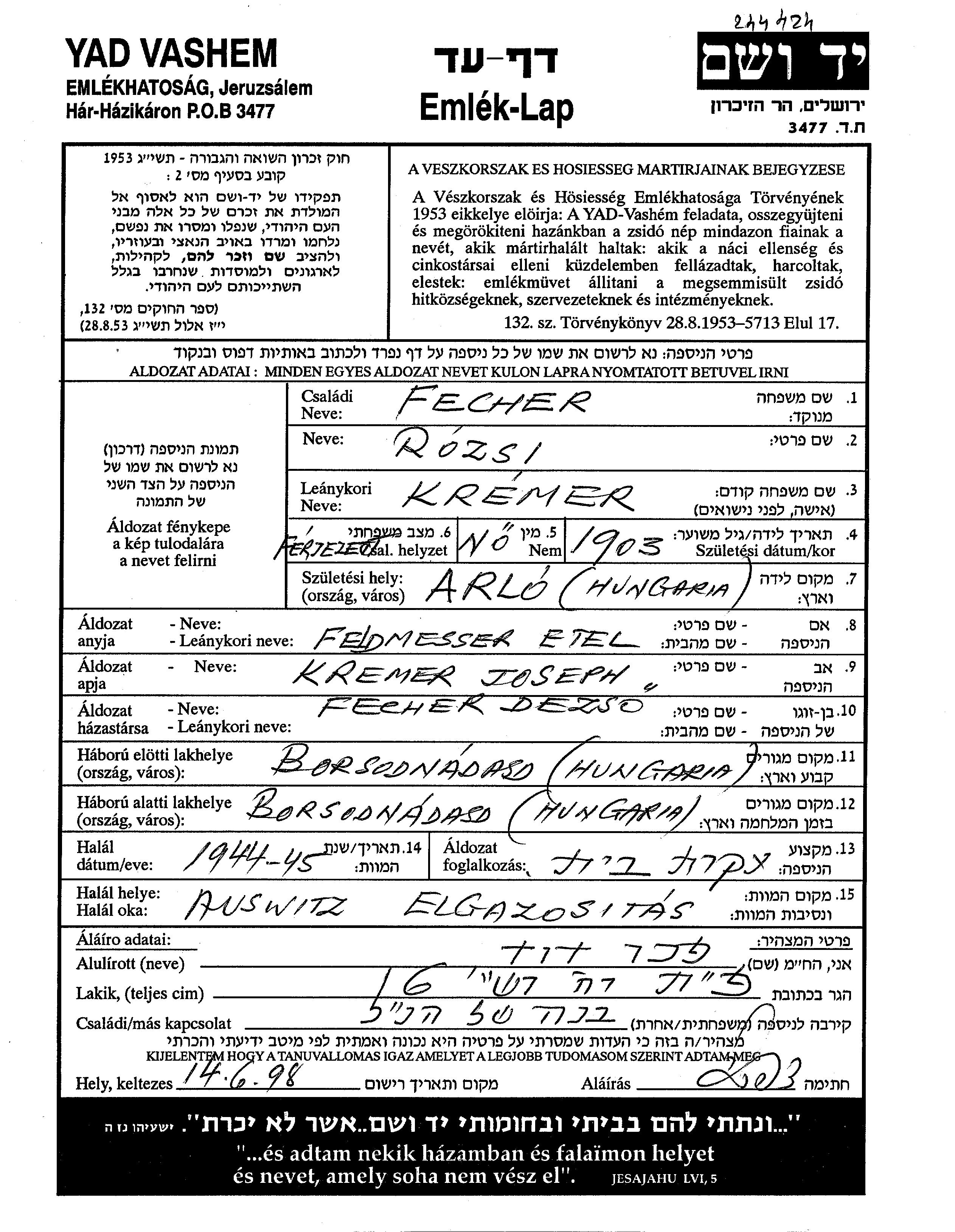 Rozsi Fecher Pekher, geb. Kremer wurde im Jahr 1903 in Arlo, Ungarn geboren. Sie war die Tochter von Joseph und Etel, geb. Feldmesser. Sie war Hausfrau und mit Dezso Verheiratet. Vor dem Zweiten Weltkrieg lebte sie in Borsodnadasd, Ungarn. Während des Krieges war sie in Borsodnadasd, Ungarn.