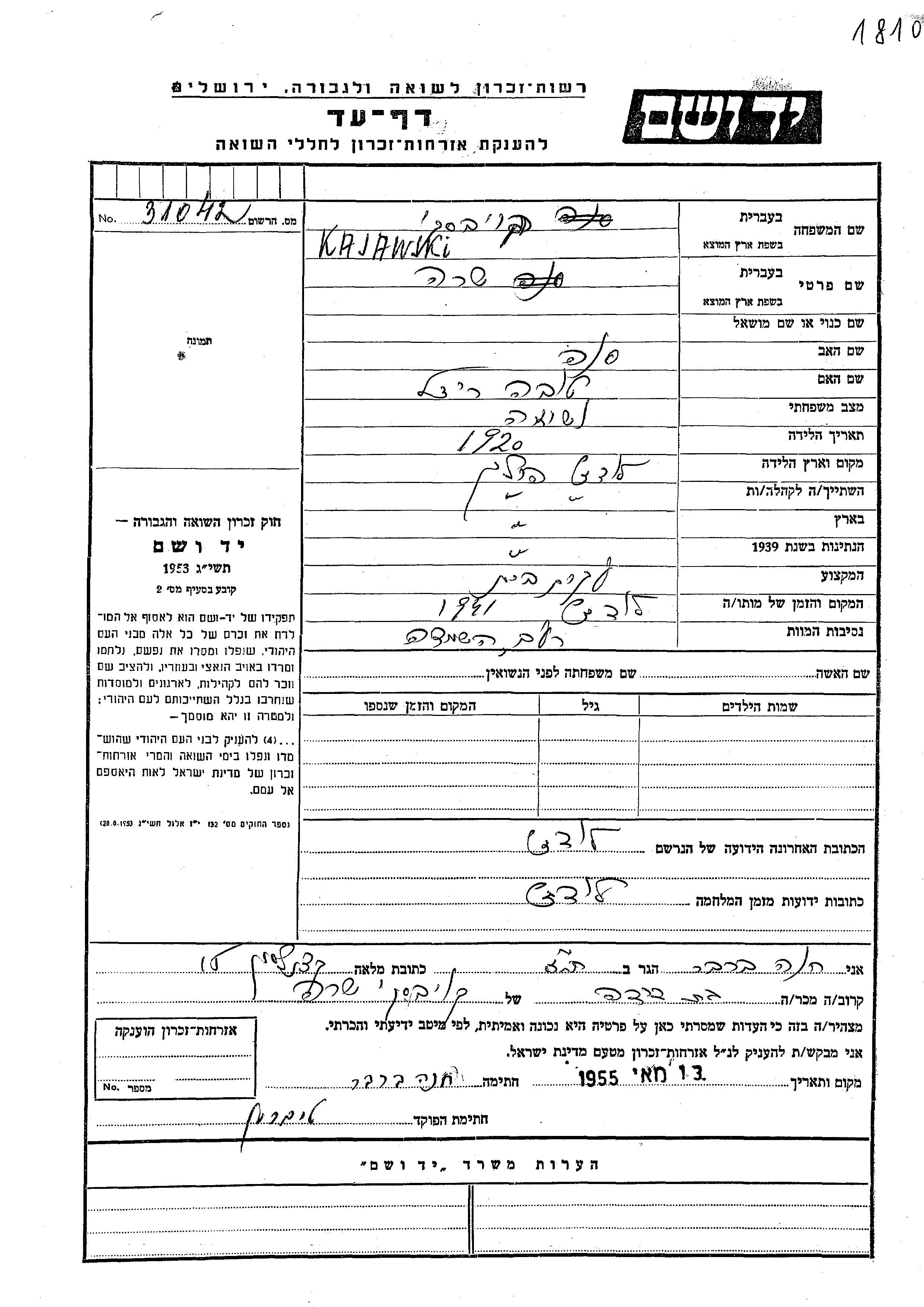 Sara Kajawski Kraievski wurde im Jahr 1920 in Lodz, Polen geboren. Sie war Hausfrau. Vor dem Zweiten Weltkrieg lebte sie in Lodz, Polen.