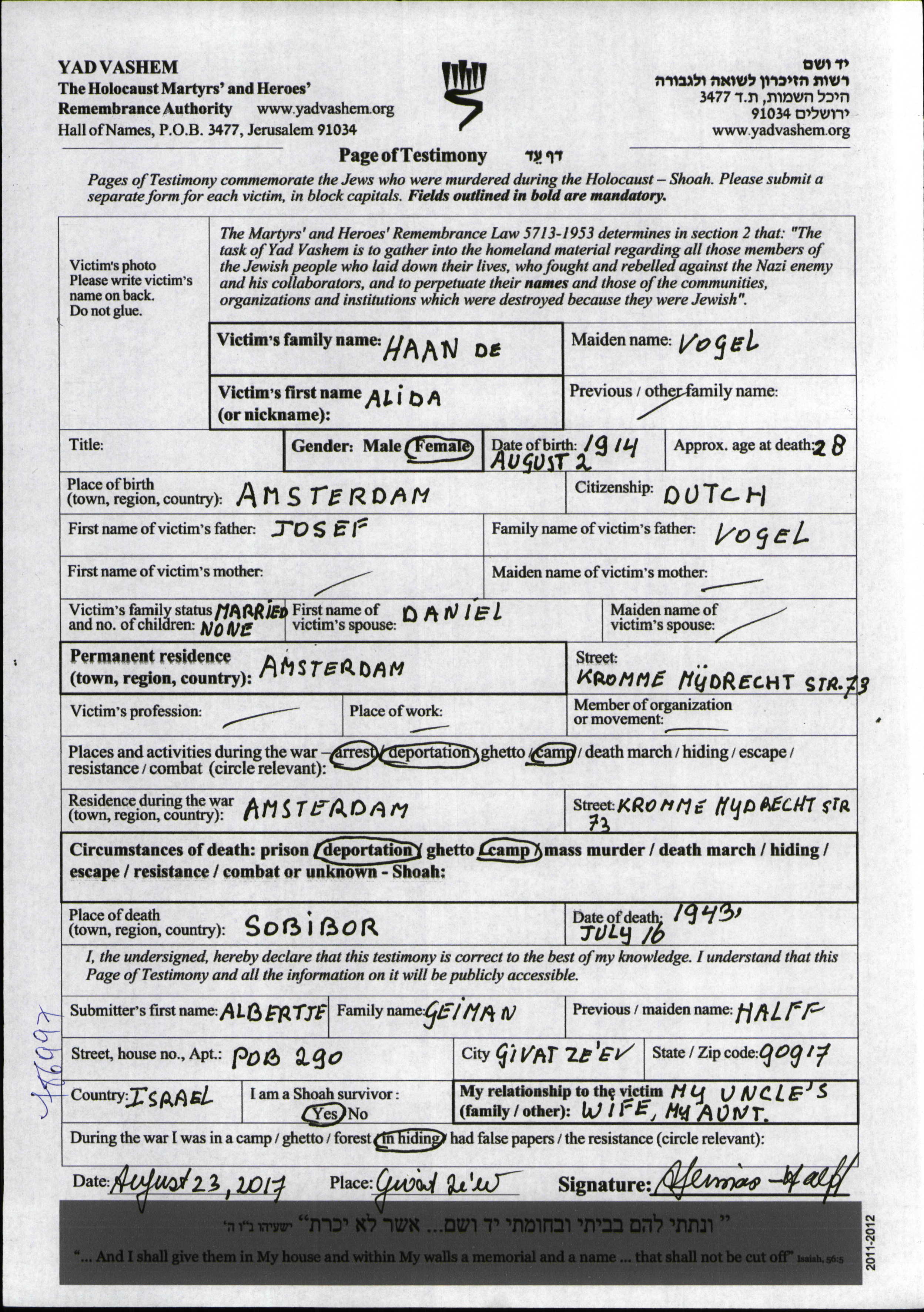 Suche nach einem Todesjahr im Zeitraum der Holocaust: 1933 bis 1945. Bitte wählen Sie 'Exakt' im Auswahlmenü, um nur nach einem einzelnen Jahr zu suchen, alternativ können Sie die flexibleren Optionen '+/- 2 Jahre' oder '+/- 5 Jahre' wählen.