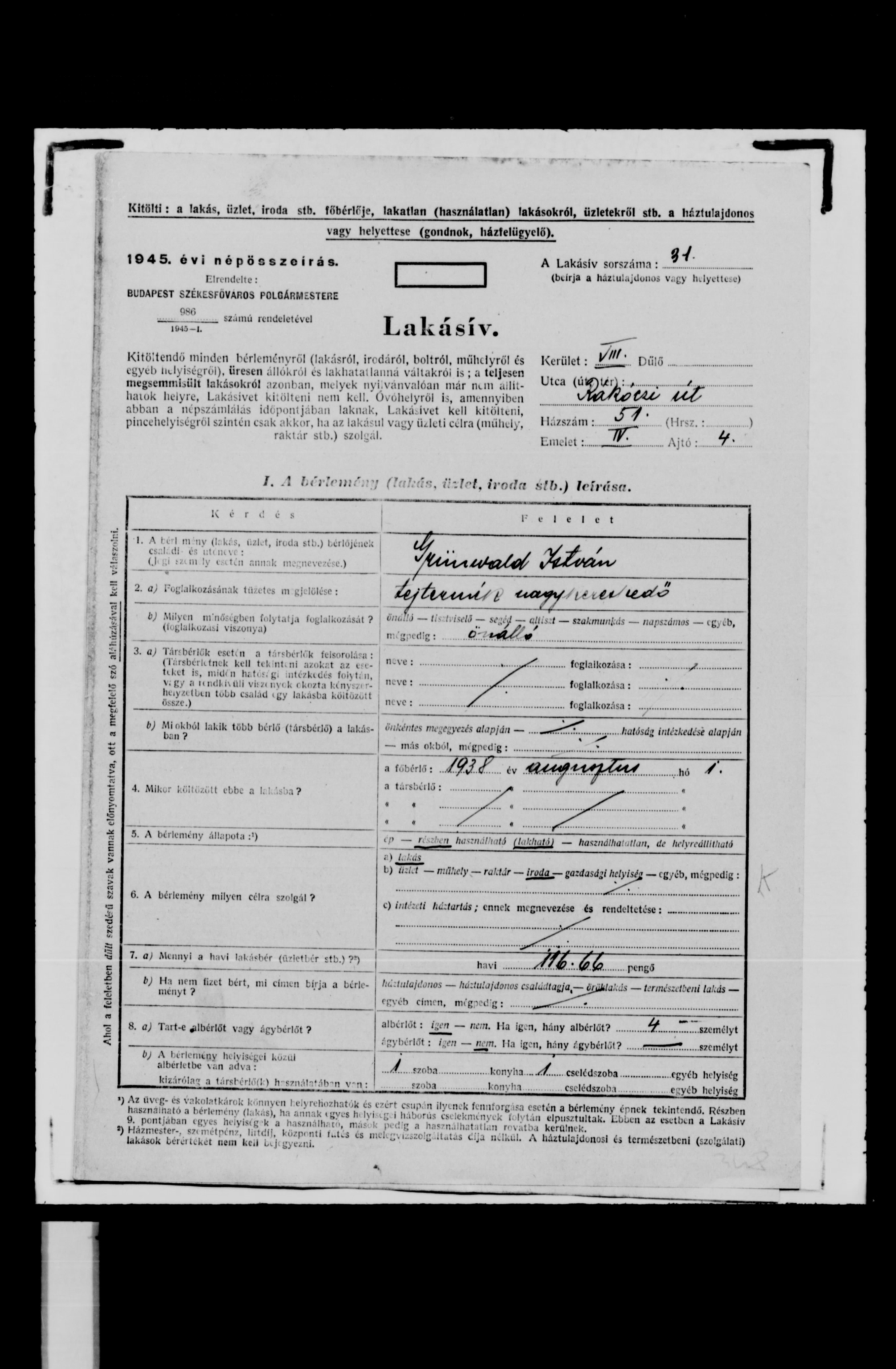 Questionnaire filled out by Grünwald István, residing at Rákóczi u., 51, 4, Quarter VIII, in the context of the Population Census in Budapest, 1945