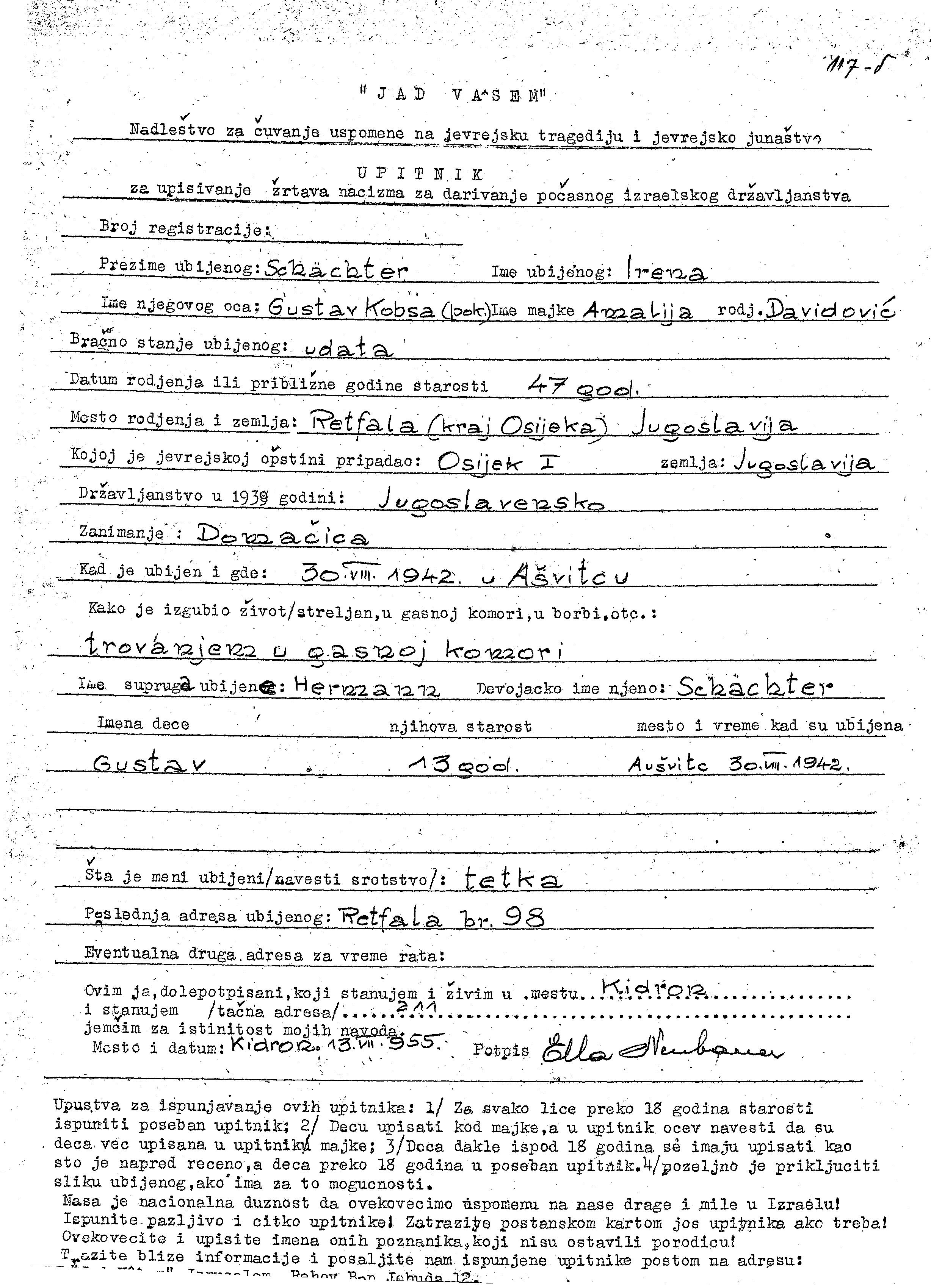 Irena Kobsa Schachter, geb. Kobsa wurde in Retfala, Jugoslawien geboren. Sie war Hausfrau. Vor dem Zweiten Weltkrieg lebte sie in Osijek, Jugoslawien.