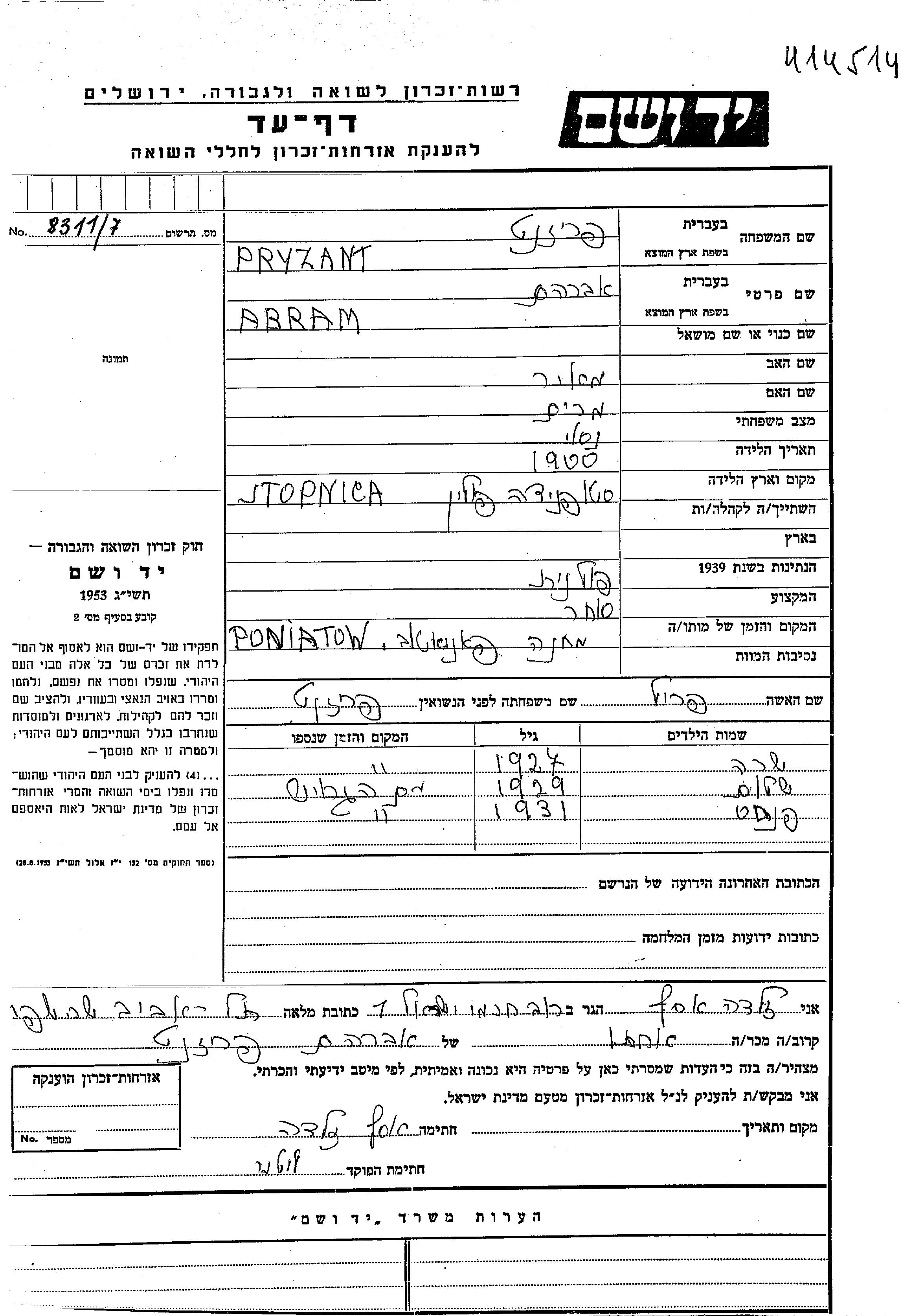 Abram Pryzant wurde in Stopnica, Polen geboren. Er war Kaufmann/-frau. Vor dem Zweiten Weltkrieg lebte er in Krakow, Polen.