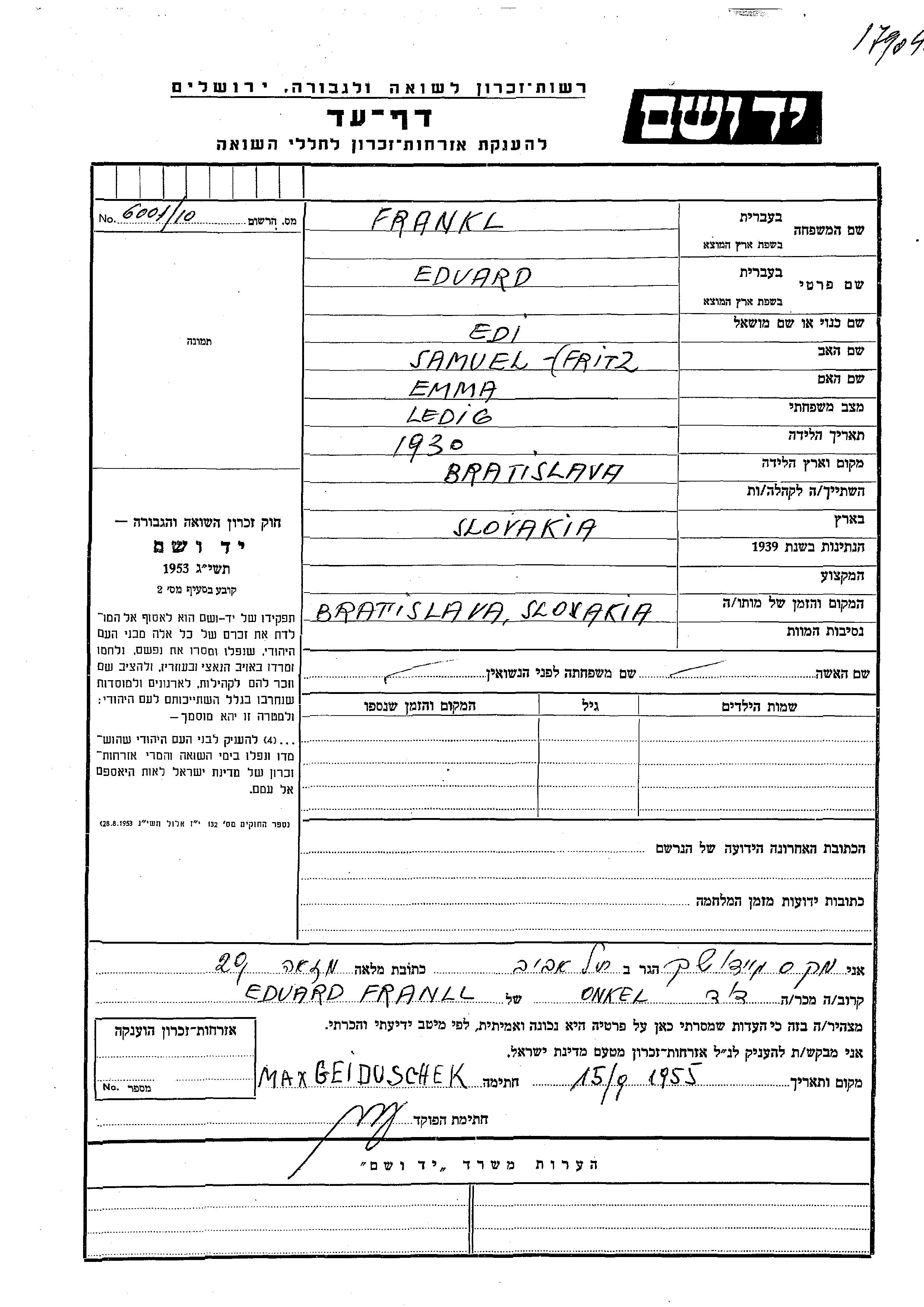 Edvard Edi wurde in der Schoah ermordet. Todesort: Bratislava, Tschechoslowakei.