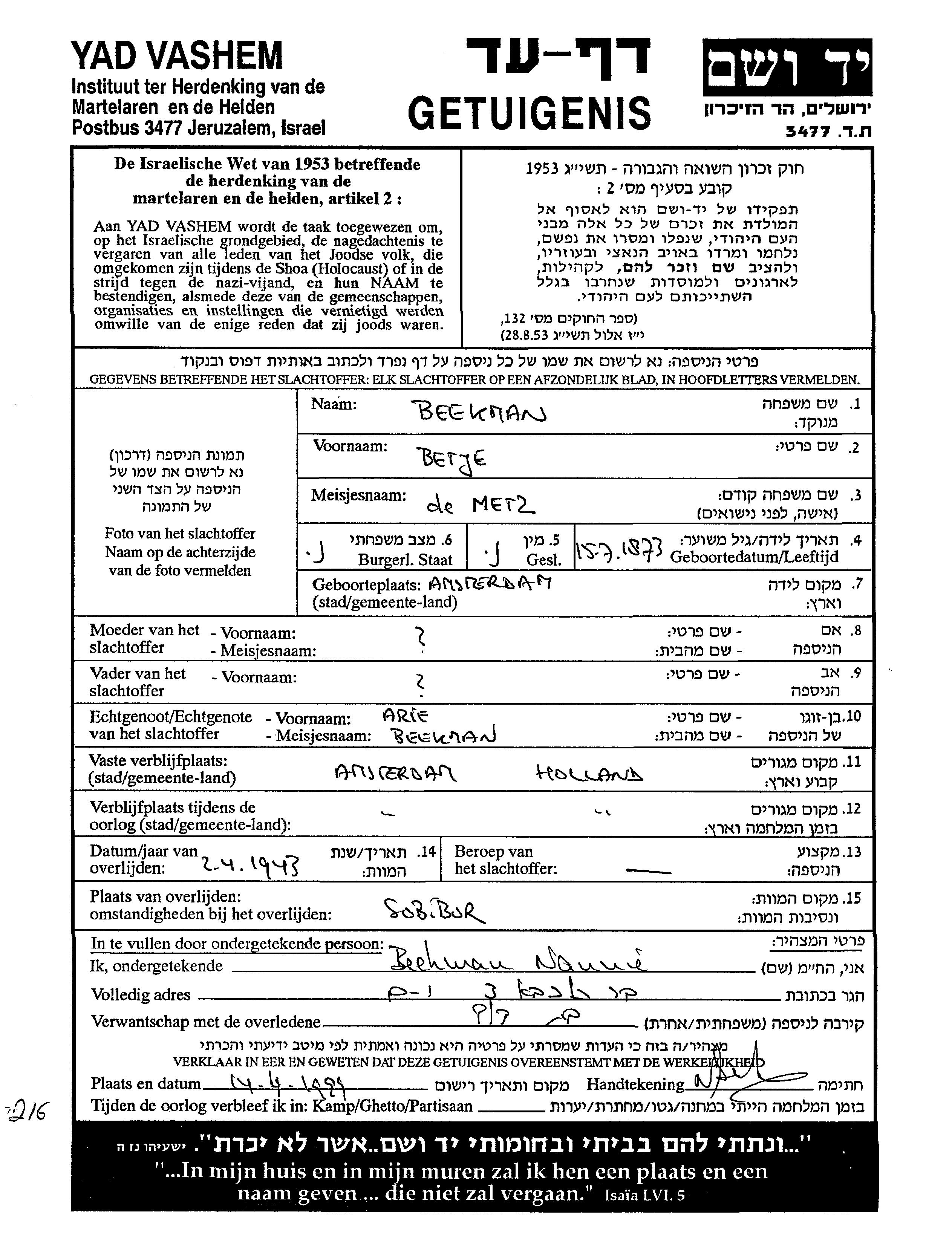 Beekman Betje 1873 Amsterdam, Niederlande Liste von ermordeten Juden aus Holland