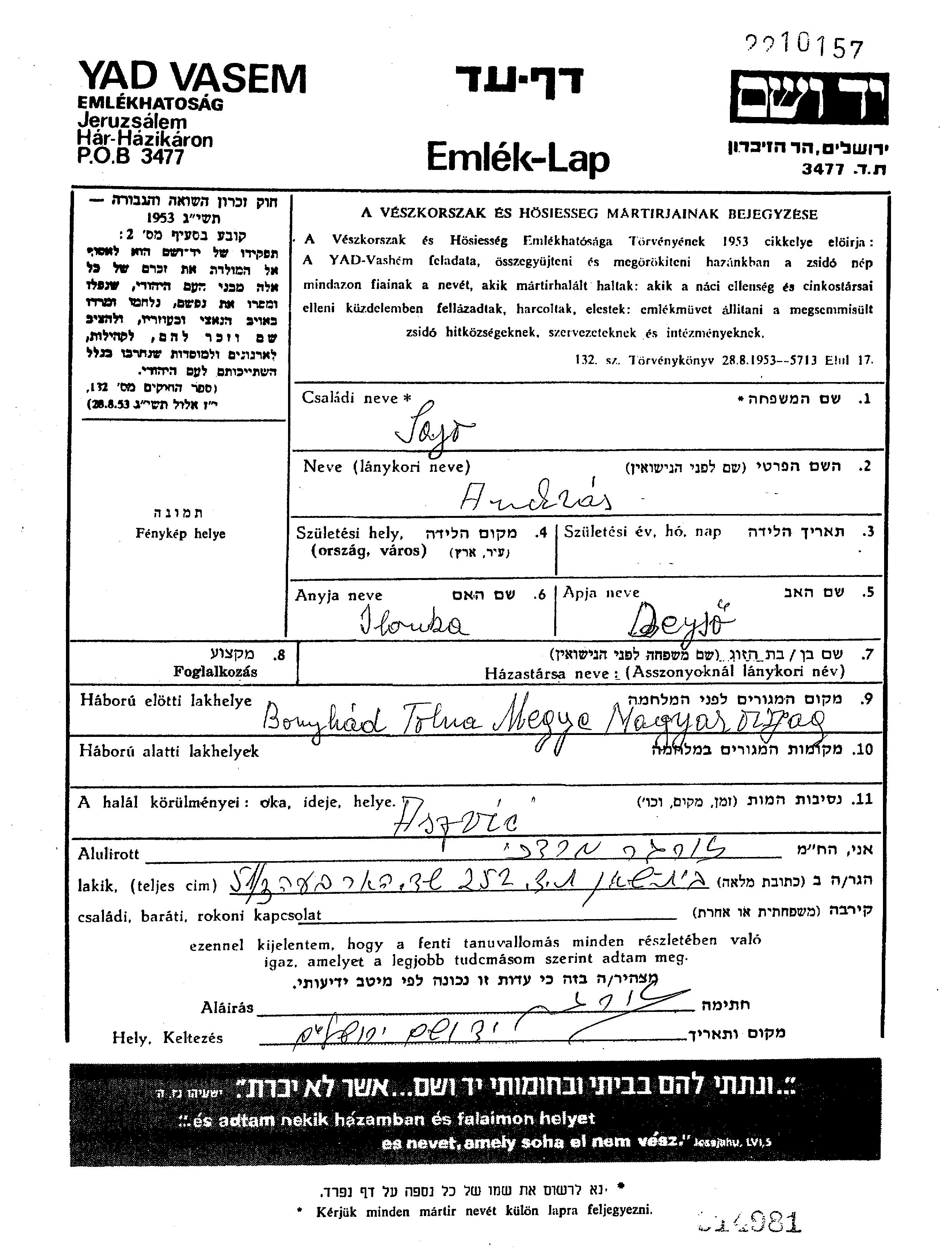| Sajo | Endre | 1937 | Bonyhad, Ungarn | Liste von ermordeten Juden aus Ungarn |
