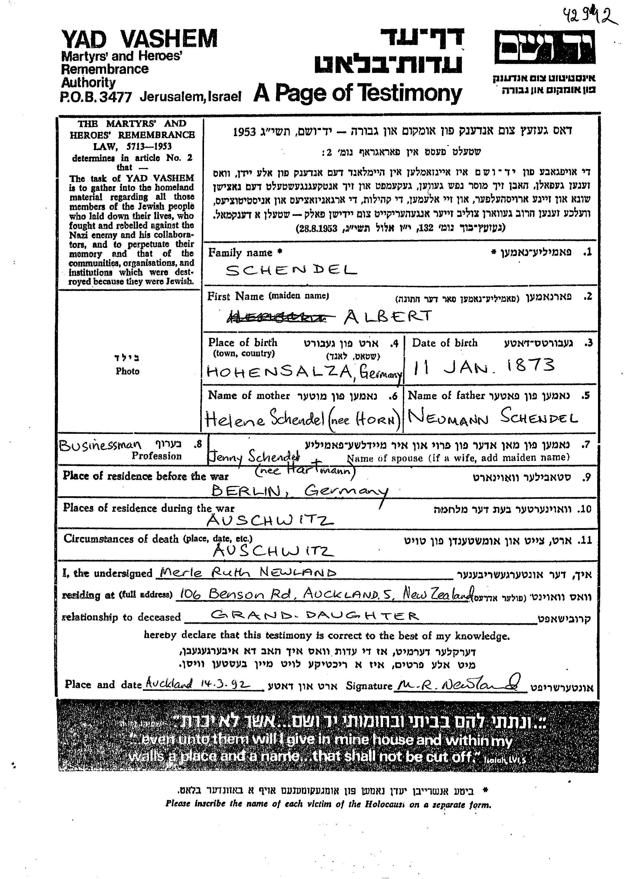 Schendel | Albert | 1873 | unbekannter Ort, | Gedenkblatt |