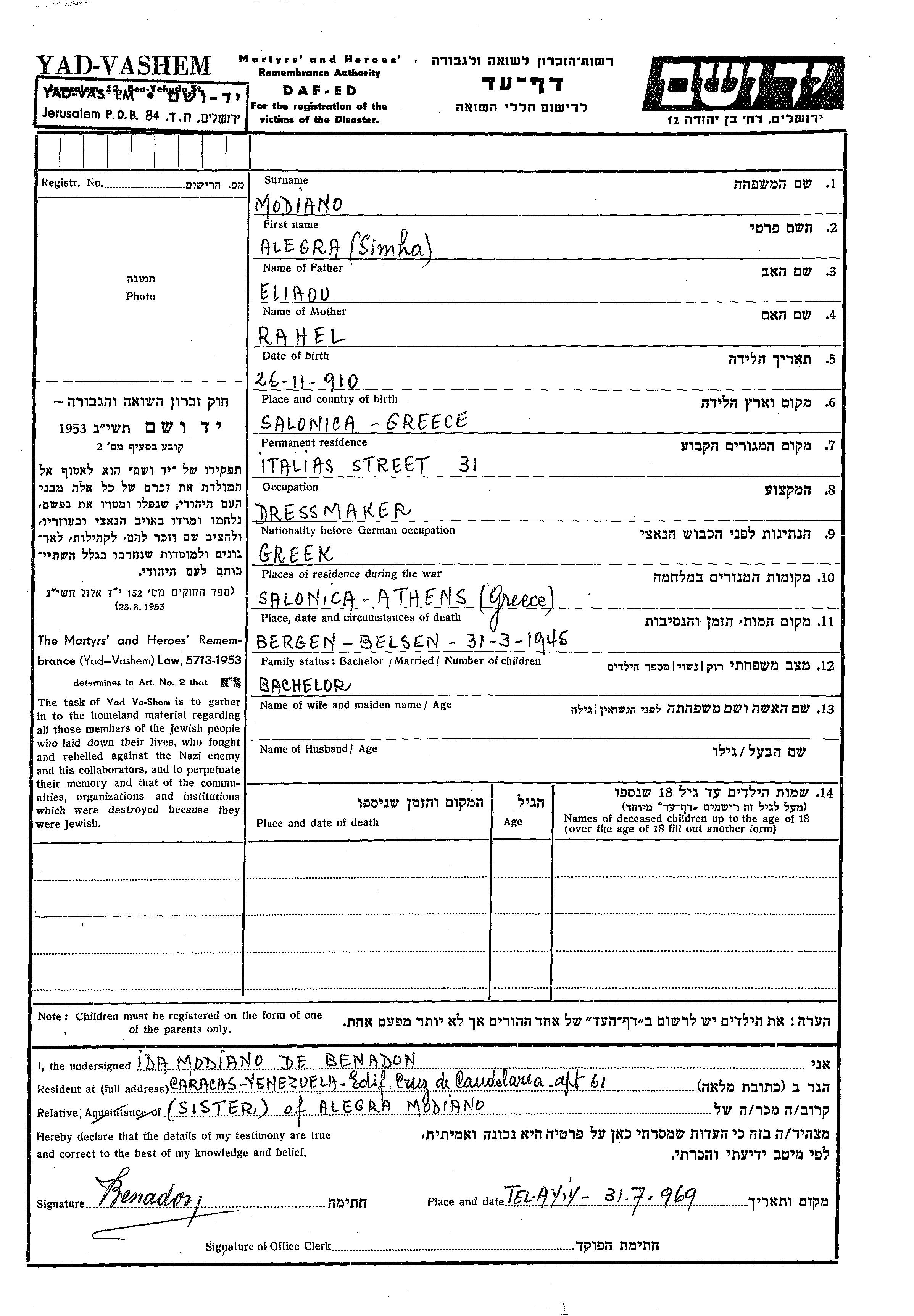 Alegra Simha Modiano wurde im Jahr 1910 in Thessaloniki, Griechenland geboren. Sie war Schneiderin. Vor dem Zweiten Weltkrieg lebte sie in Thessaloniki, Griechenland.
