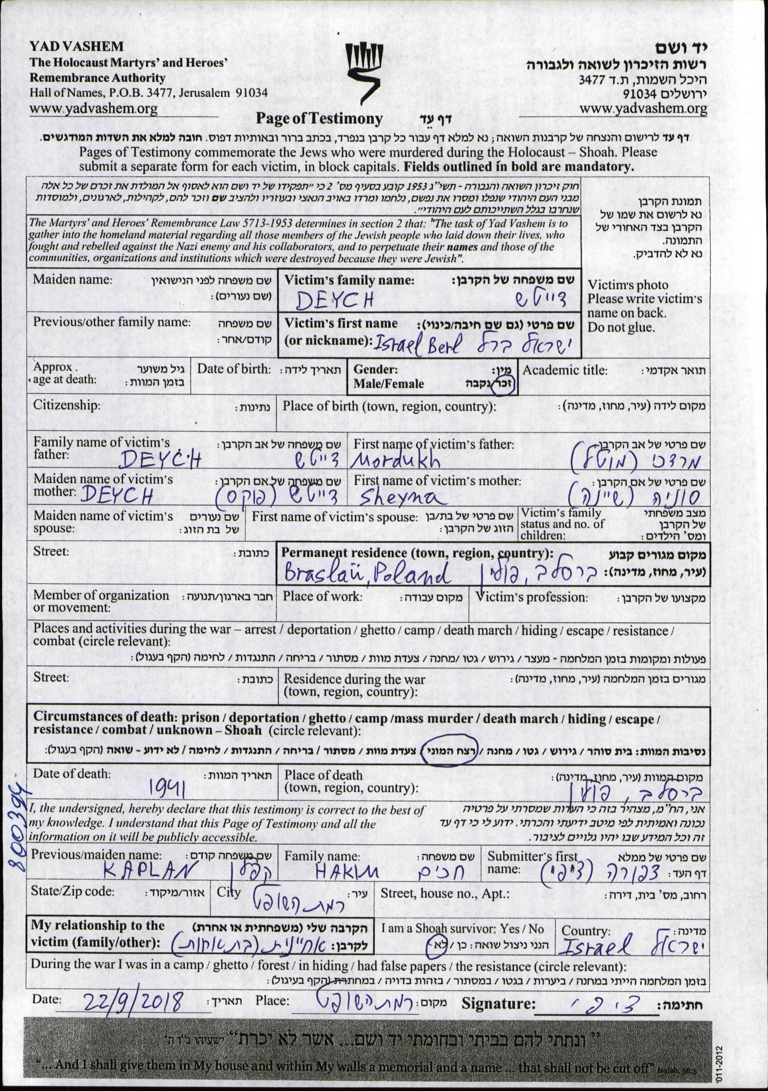 Israel Berl Deych. Vor dem Zweiten Weltkrieg lebte er in Braslaw, Polen.