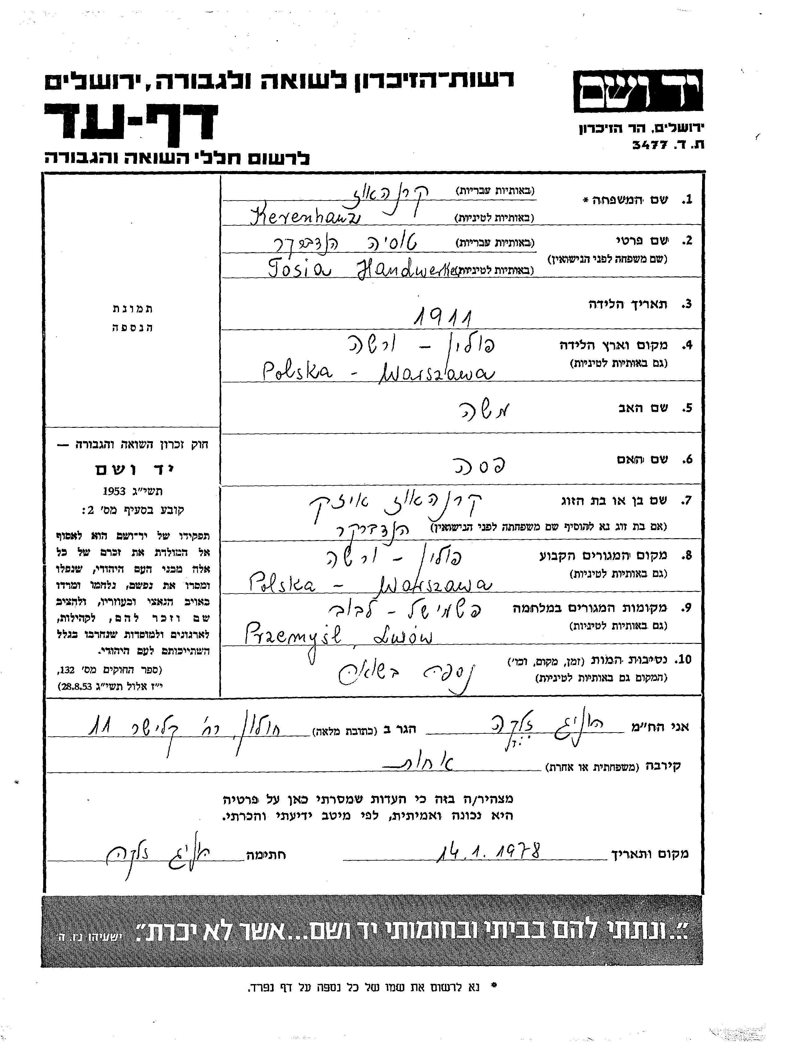 Tosia Tauba Kerenhauz, geb. Handwerker wurde im Jahr 1910 in Warsaw, Polen geboren. Vor dem Zweiten Weltkrieg lebte sie in Warsaw, Polen.