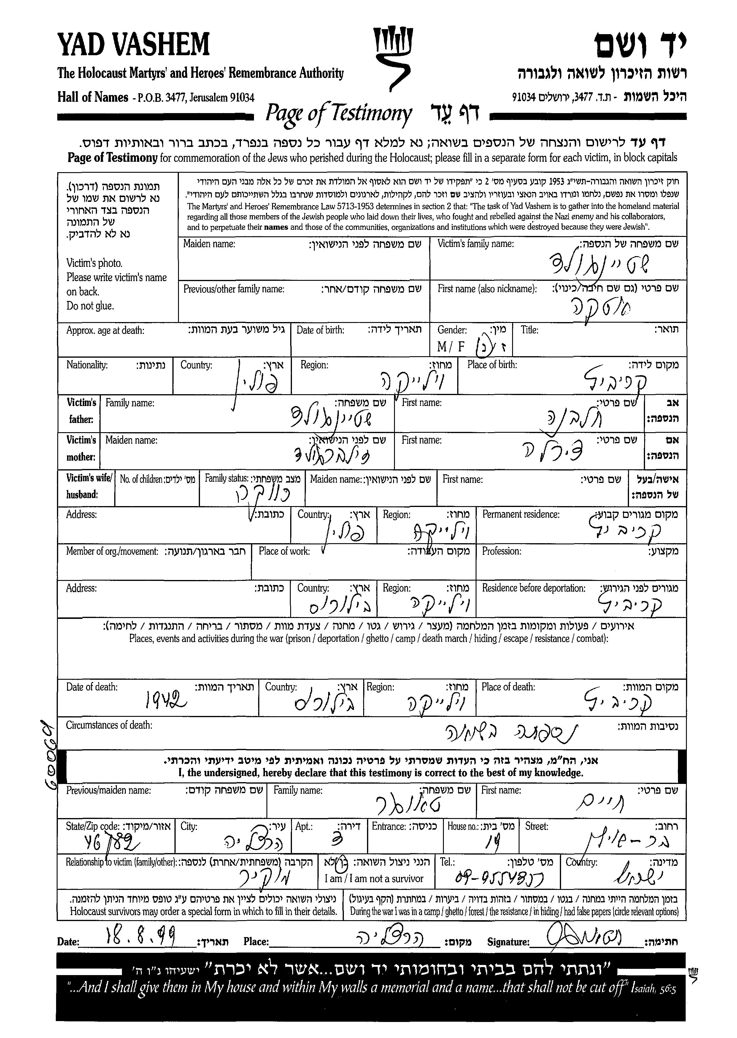 Shteingold | Etka | Krzywicze, Polen | Gedenkblatt | |