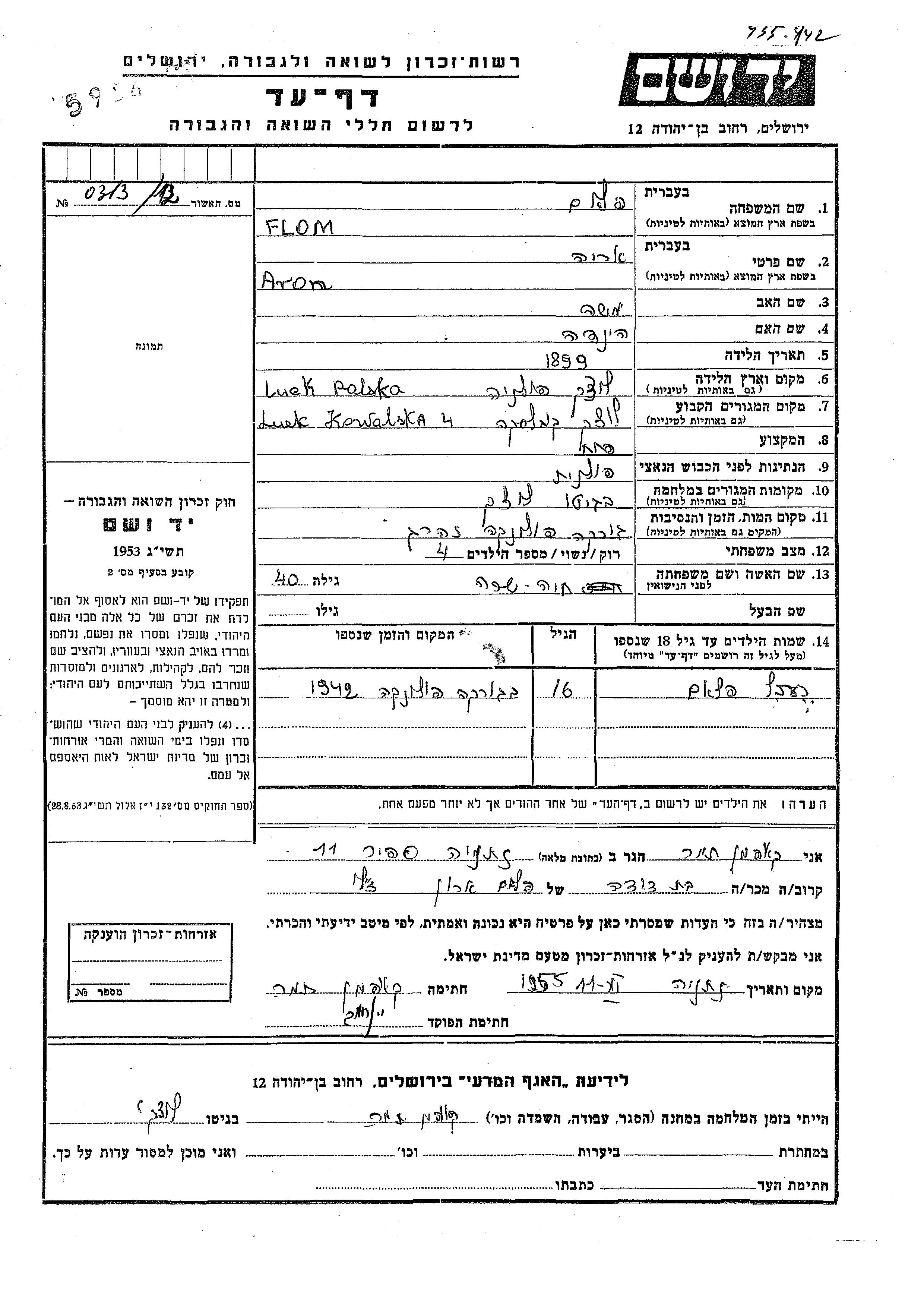 Aron Arie Flom wurde im Jahr 1899 in Luck, Polen geboren. Er war der Sohn von Moshe und Hinda. Er war Blechschmied und mit Khaia Sara Verheiratet. Vor dem Zweiten Weltkrieg lebte er in Luck, Polen. Während des Krieges war er in Luck, Polen.