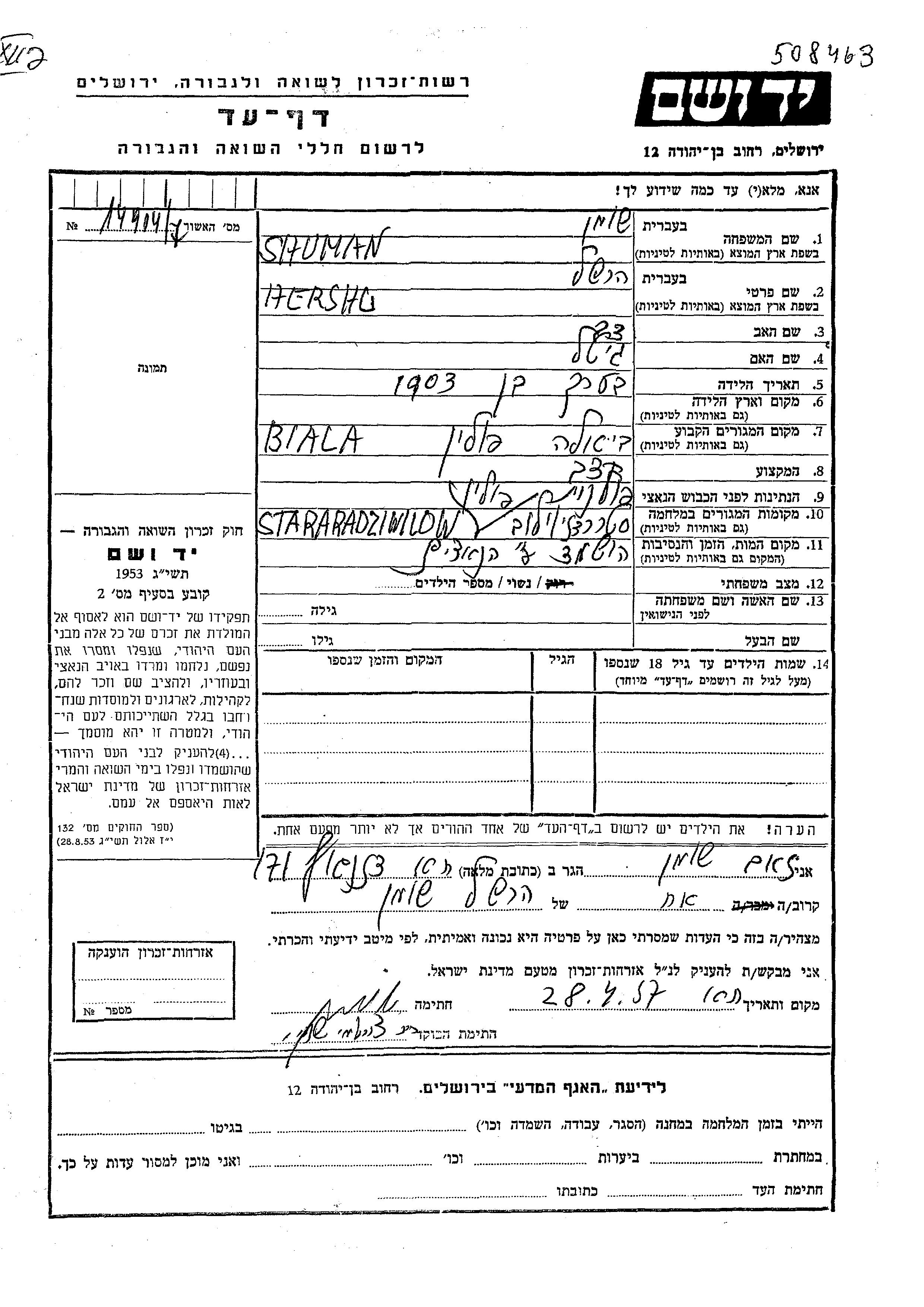Hershl Sauman Shuman wurde im Jahr 1903 geboren. Er war der Sohn von Dov und Gitel. Er war Metzger/-in und Verheiratet. Vor dem Zweiten Weltkrieg lebte er in Biala, Polen. Während des Krieges war er in Stararadzowilow, Polen.