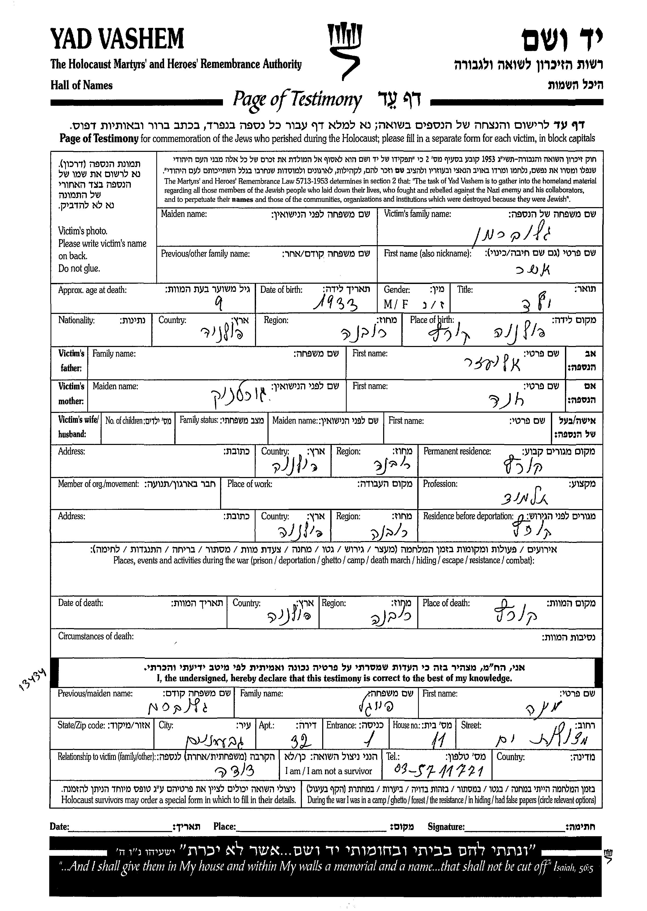 Asher wurde in der Schoah ermordet. Todesort: Korzec, Polen.