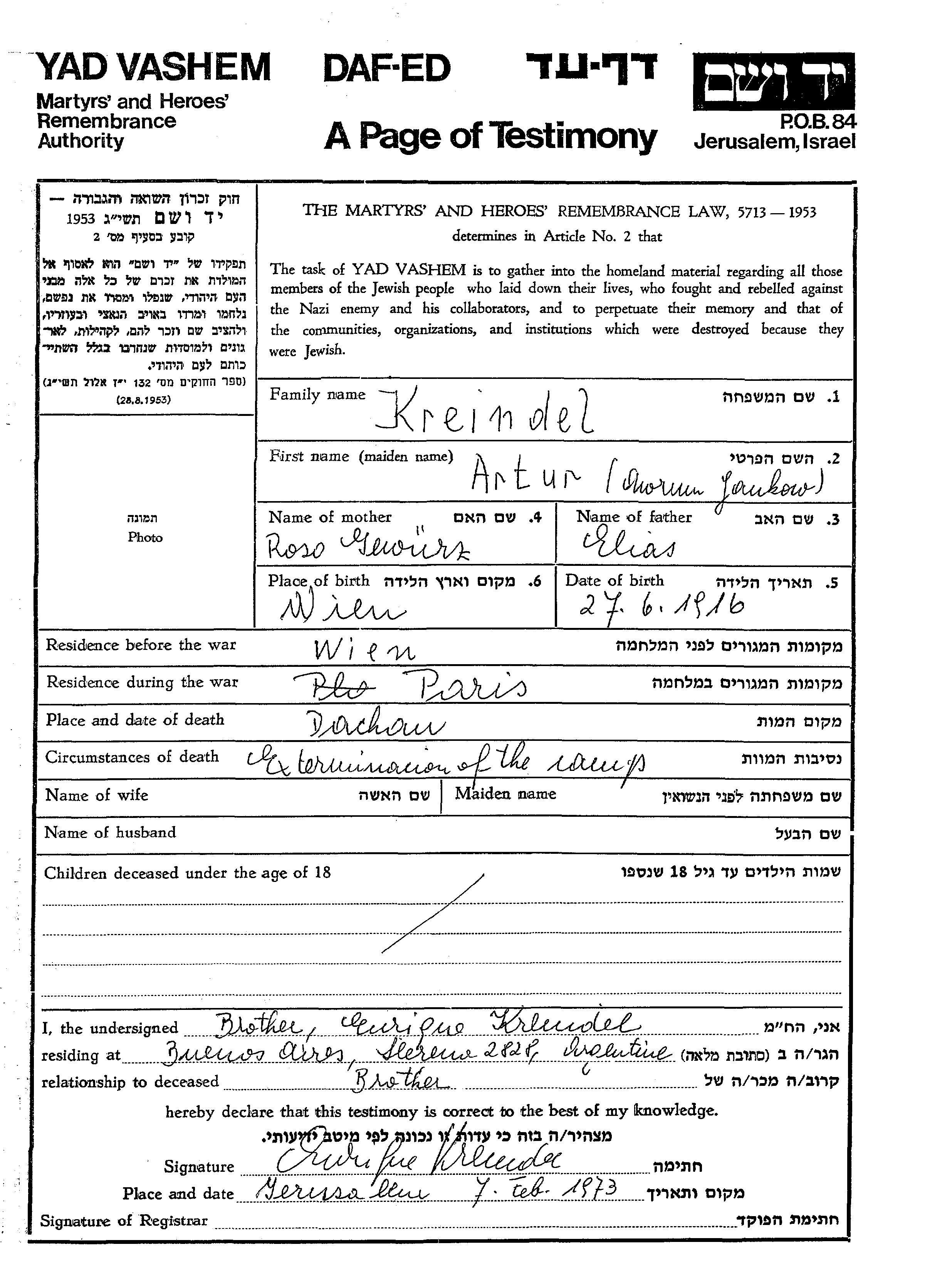 Kreindel Arthur 1916 Wien, Österreich Liste von ermordeten oesterreichischen Juden