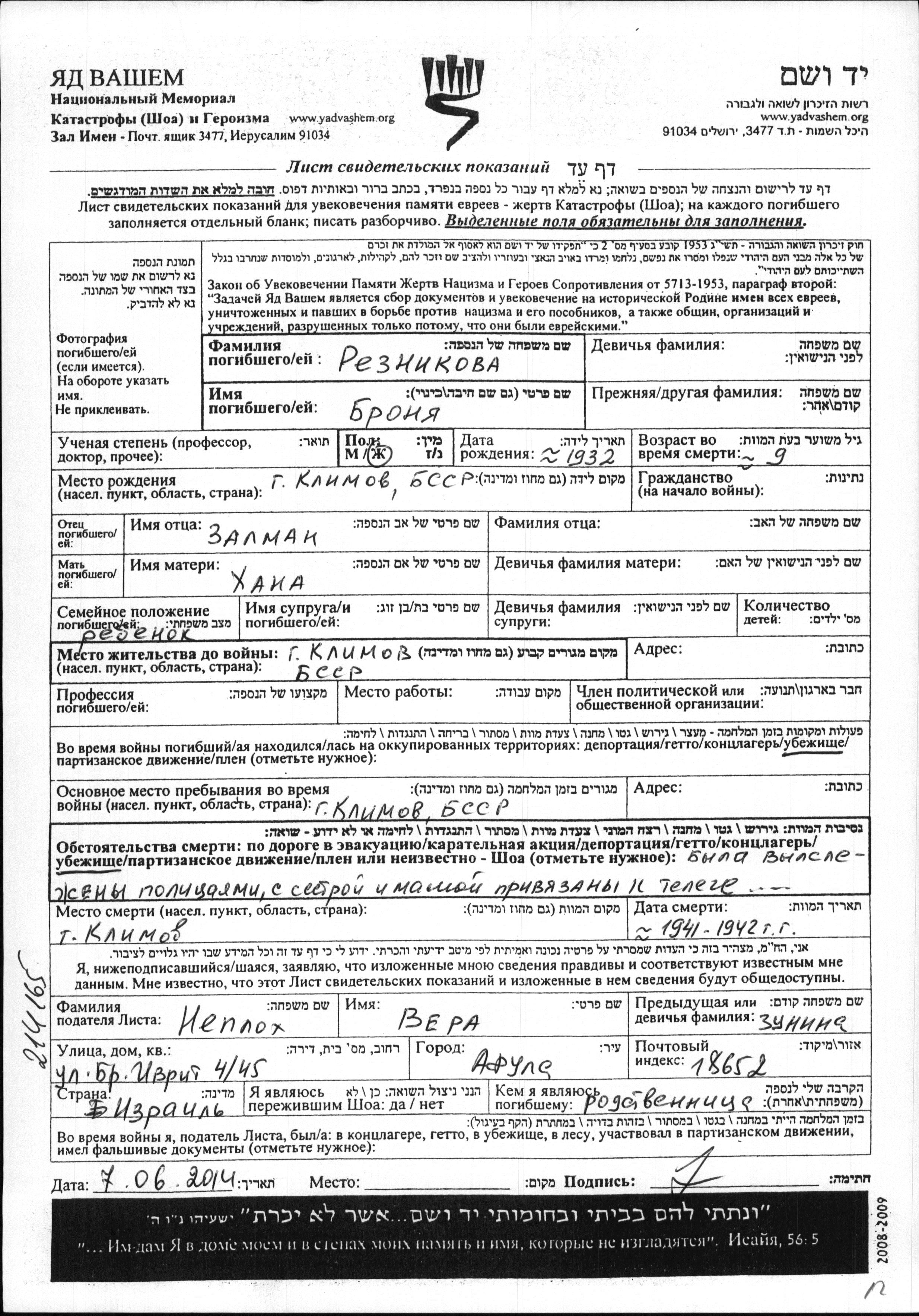 Reznikova Bronya Klimovo, Russland (UdSSR) Verfolgtenliste