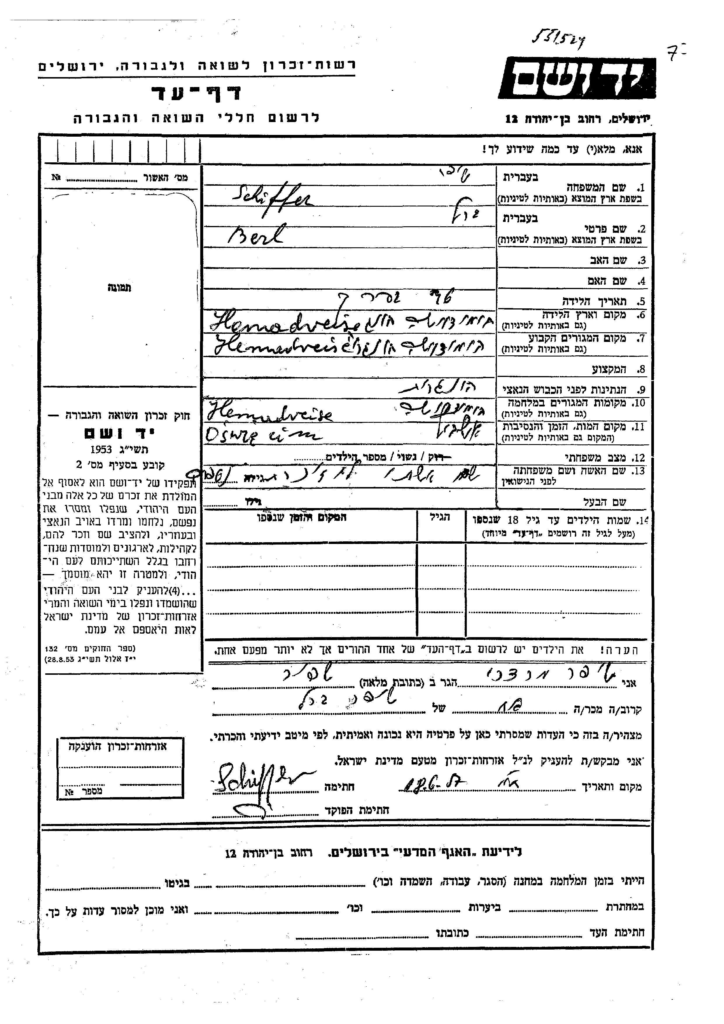 Berl Schiffer wurde in Kismedves, Tschechoslowakei geboren. Er war Verheiratet. Vor dem Zweiten Weltkrieg lebte er in Kismedves, Tschechoslowakei. Während des Krieges war er in Kismedves, Tschechoslowakei.
