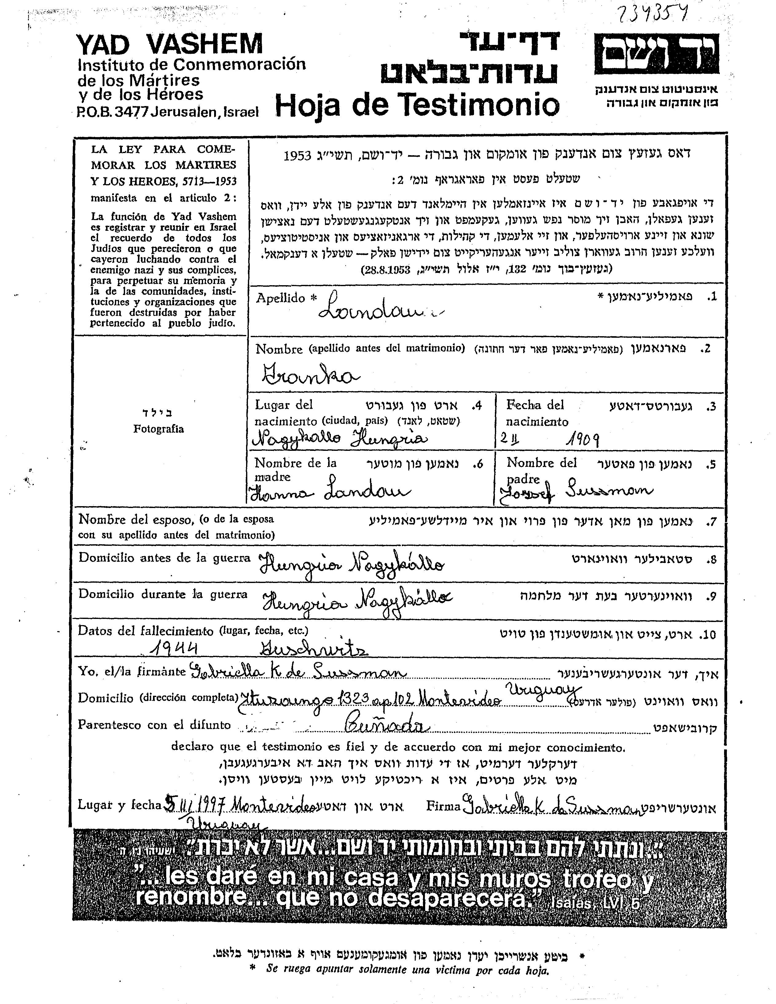 Aronko Sussman Landau, geb. Landau wurde im Jahr 1909 in Nagykallo, Ungarn geboren. Vor dem Zweiten Weltkrieg lebte sie in Nagykallo, Ungarn.