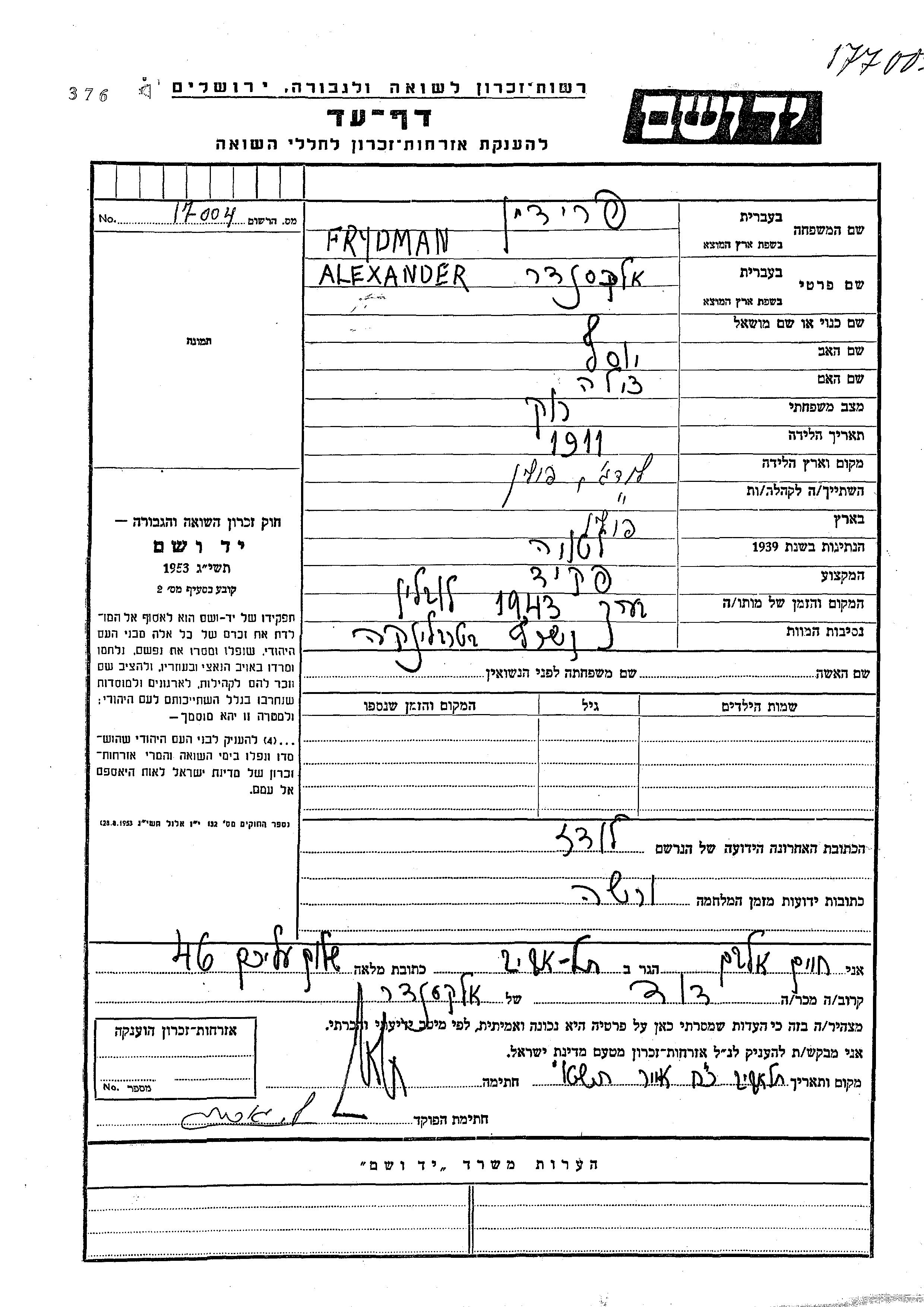 Frydman Alexander 1911 Lodz, Polen Gedenkblatt