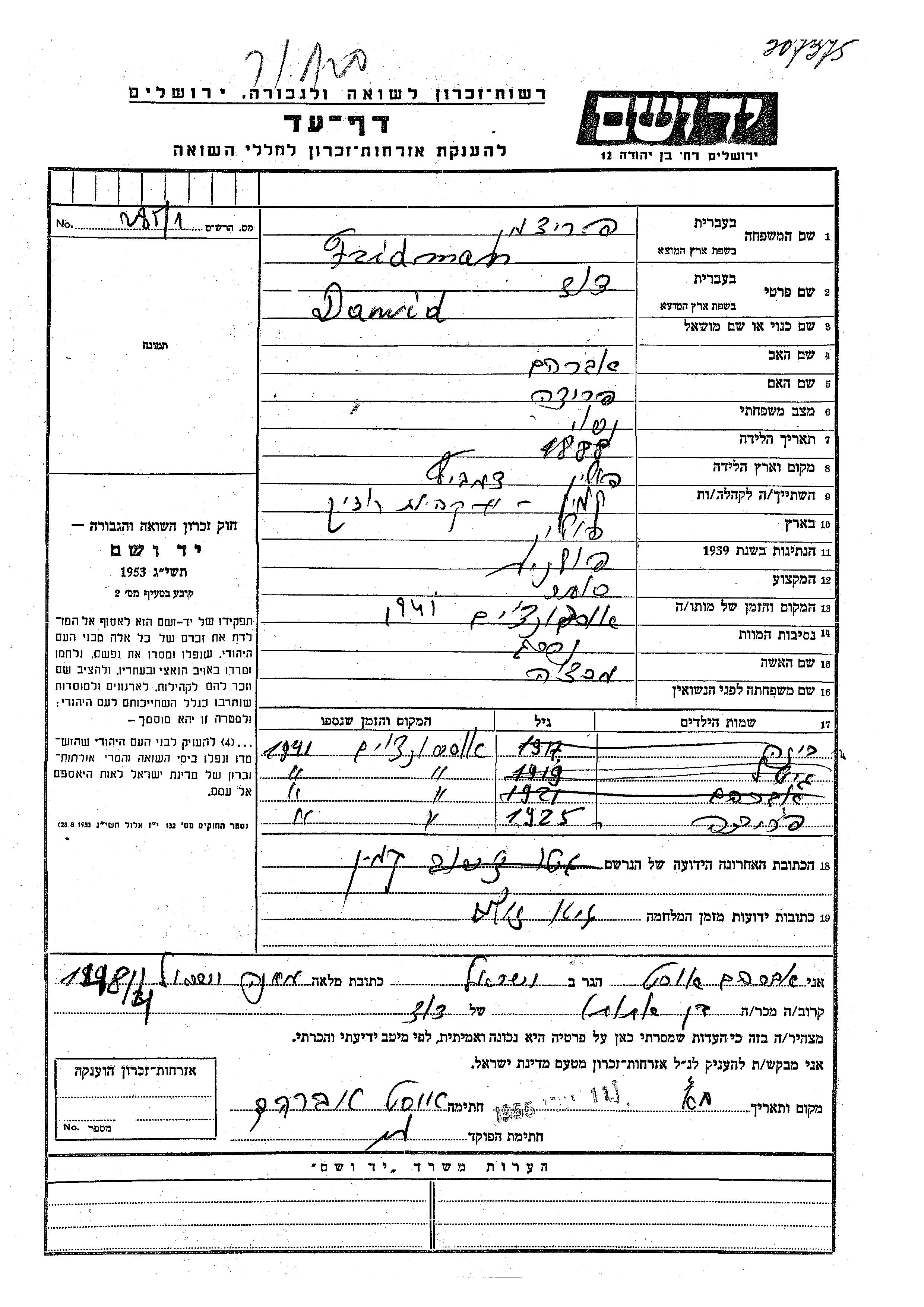 Dawid Fridman wurde im Jahr 1888 in Debice, Polen geboren. Er war der Sohn von Avraham und Frida. Er war Kaufmann/-frau und mit Marcha Verheiratet. Vor dem Zweiten Weltkrieg lebte er in Kamien, Polen. Während des Krieges war er in Rzeszow, Polen.