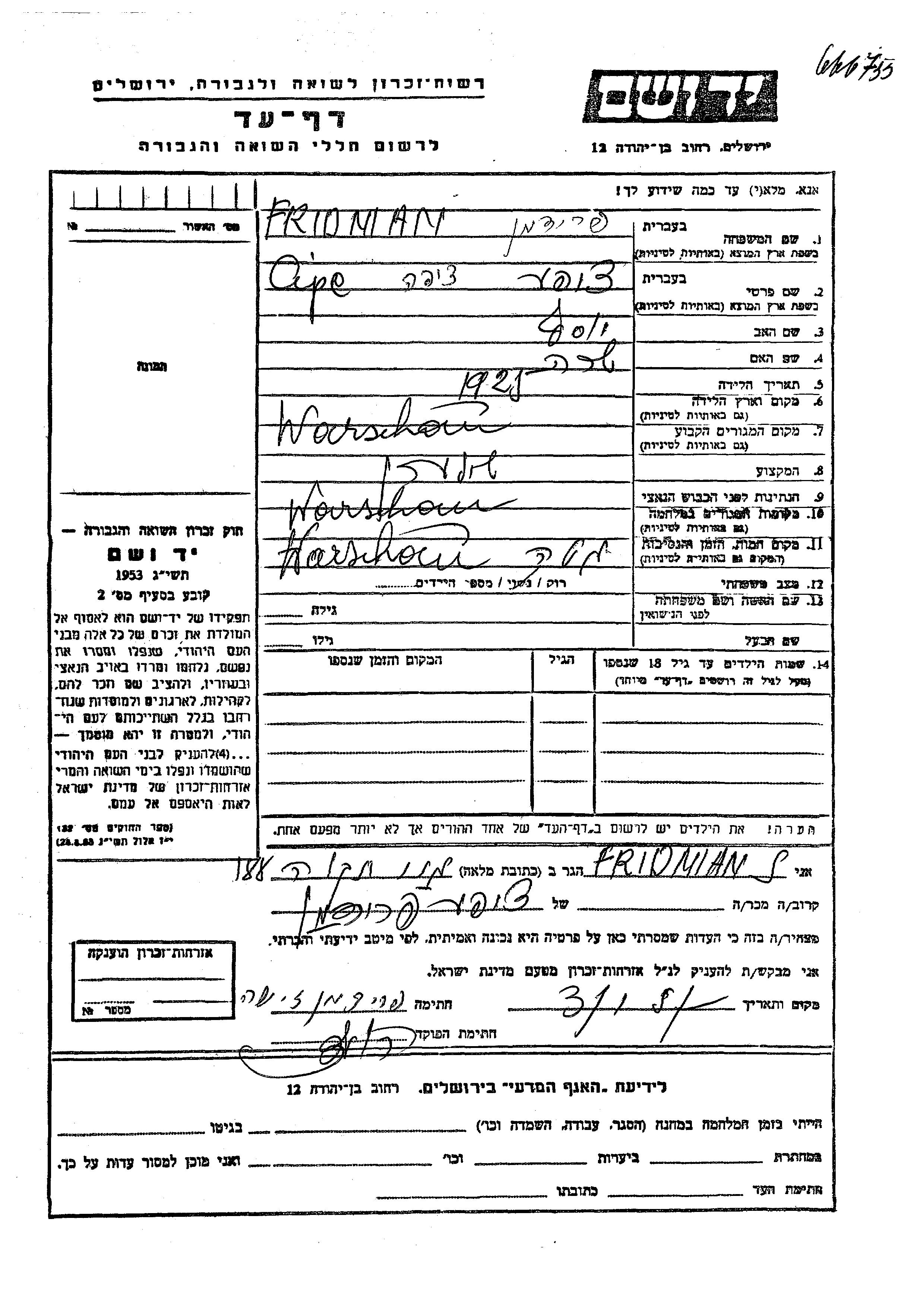 Cipe Fridman wurde im Jahr 1925 in Warszawa, Polen geboren. Sie war die Tochter von Yosef und Sara. Sie war Schüler/-in. Vor dem Zweiten Weltkrieg lebte sie in Warszawa, Polen. Während des Krieges war sie in Warszawa, Polen.