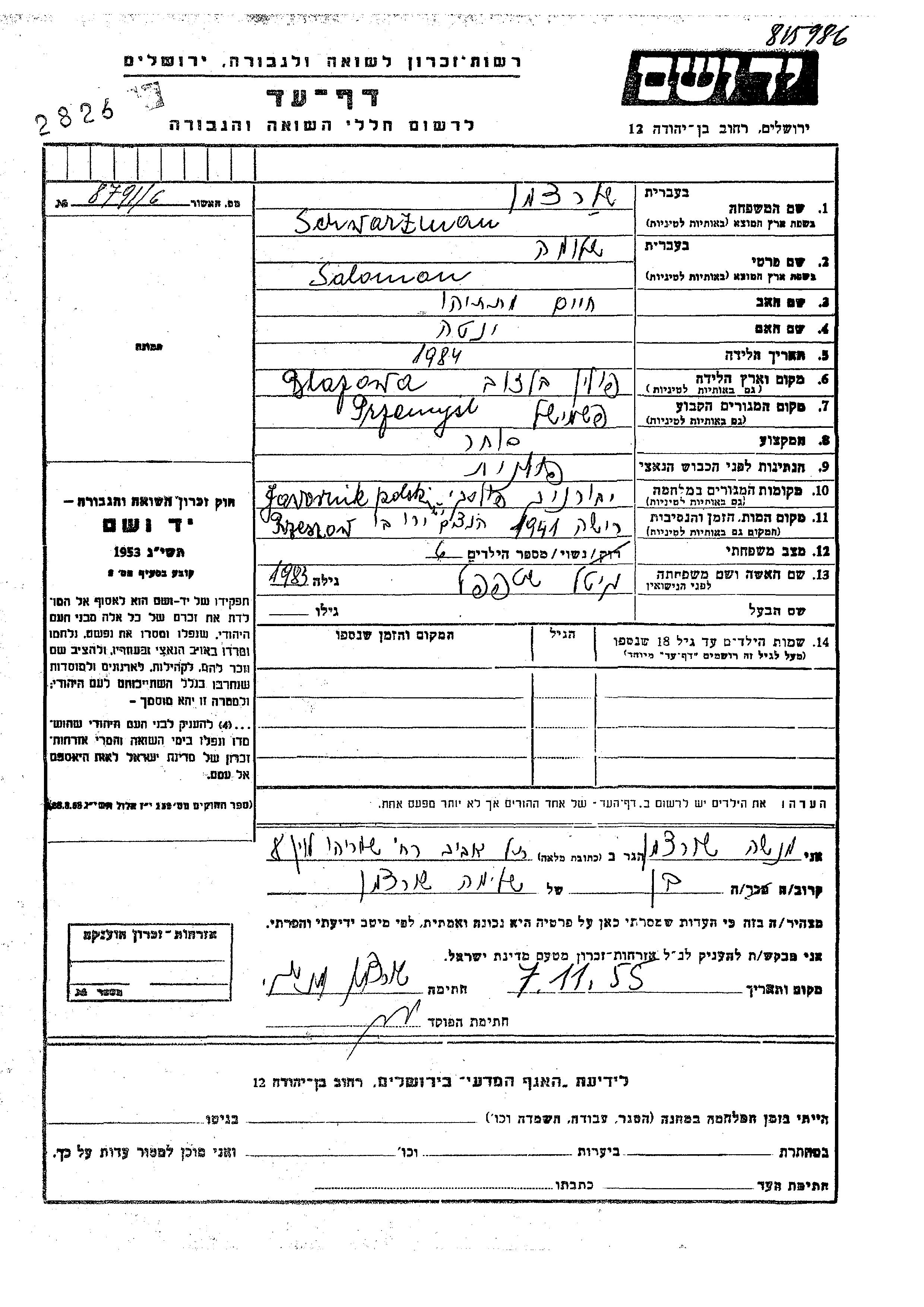 Salomon Schwarzman wurde im Jahr 1884 in Blazowa, Polen geboren. Er war der Sohn von Khaim Matatiahu und Yenta. Er war Kaufmann/-frau und mit Matilda, geb. Shtepel Verheiratet. Vor dem Zweiten Weltkrieg lebte er in Przemysl, Polen. Während des Krieges war er in Jawornik, Polen.