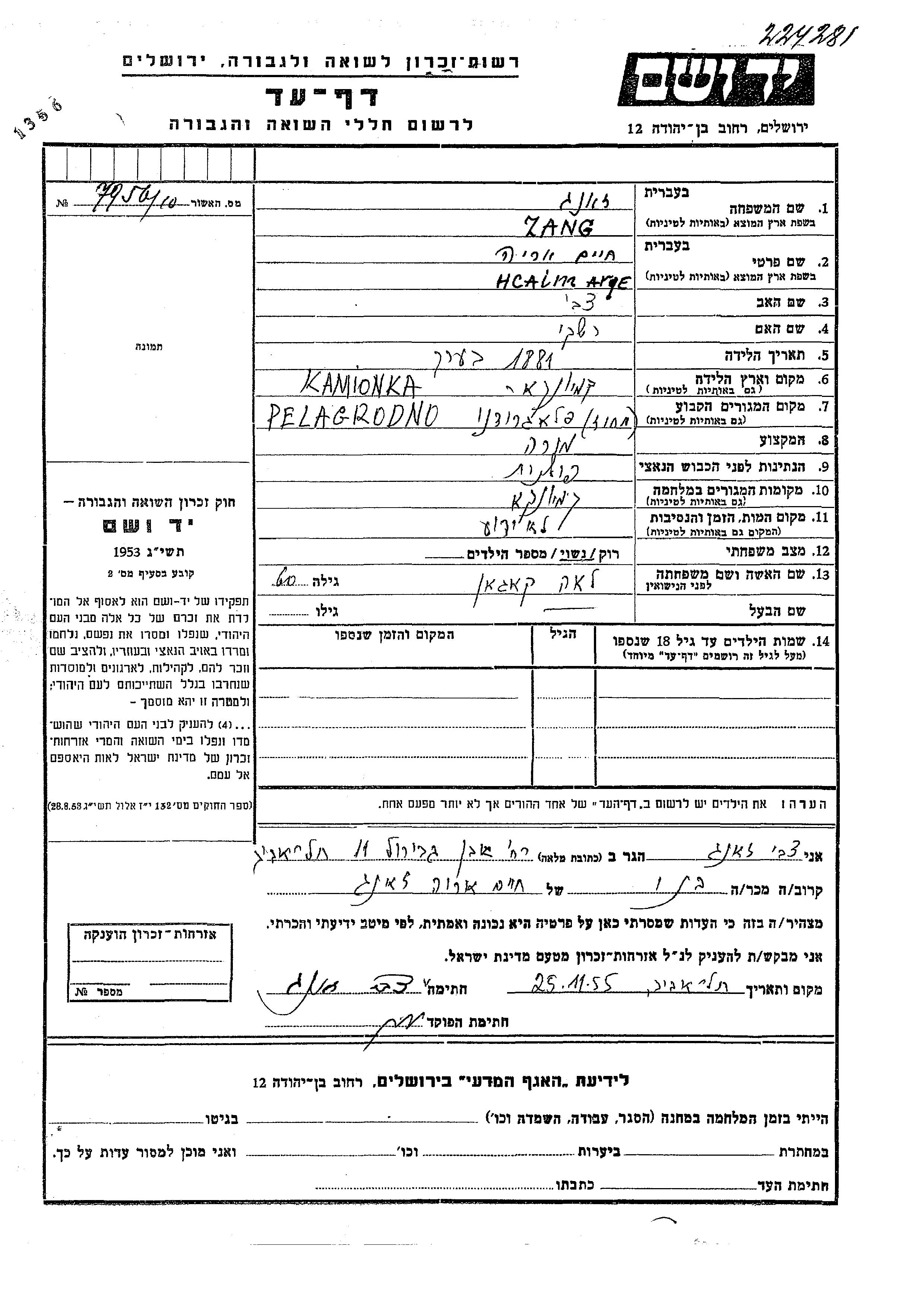 Chaim Arje Tzank Zang wurde im Jahr 1881 in Kamionka, Polen geboren. Er war der Sohn von Tzvi und Rakhel. Er war Lehrer/in und mit Lea, geb. Kogan Verheiratet. Vor dem Zweiten Weltkrieg lebte er in Kamionka, Polen. Während des Krieges war er in Kamionka, Polen.
