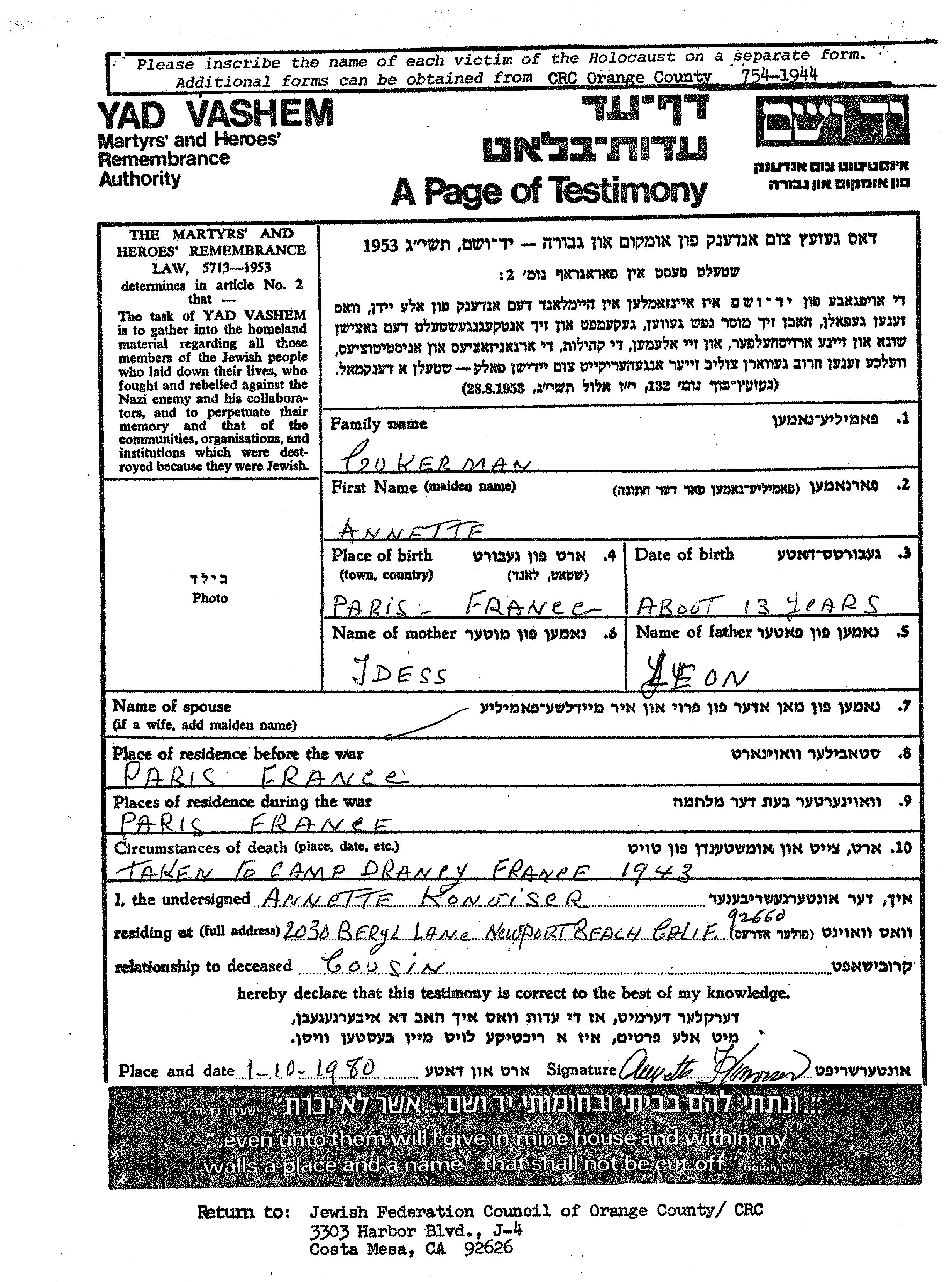 Cukerman Annette Paris, Frankreich Gedenkblatt
