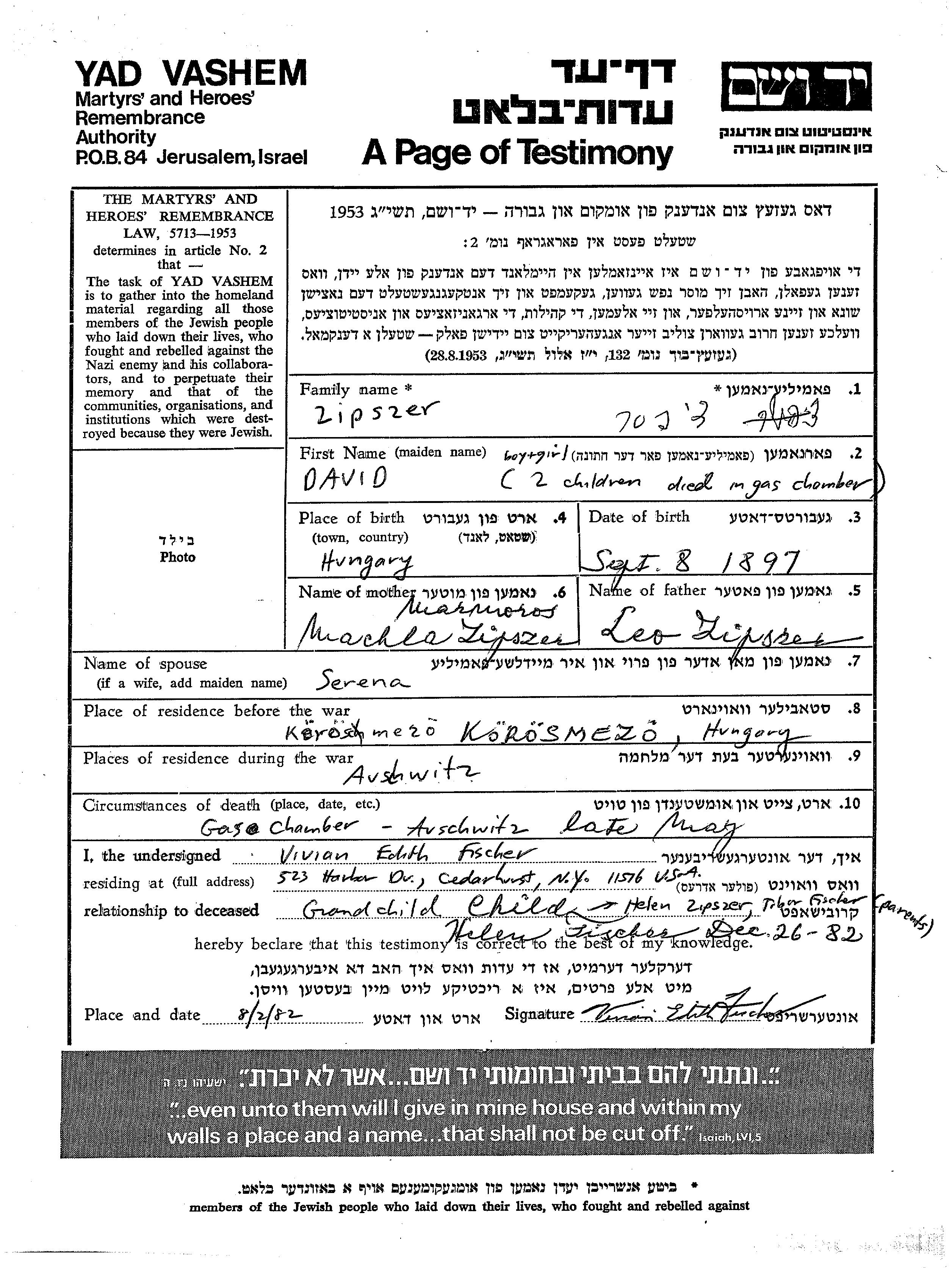 David Zipszer wurde im Jahr 1897 in Ungarn geboren. Er war der Sohn von Leo und Machla. Er war mit Serena Verheiratet. Vor dem Zweiten Weltkrieg lebte er in Korosmezo, Tschechoslowakei. Während des Krieges war er in Korosmezo, Tschechoslowakei.