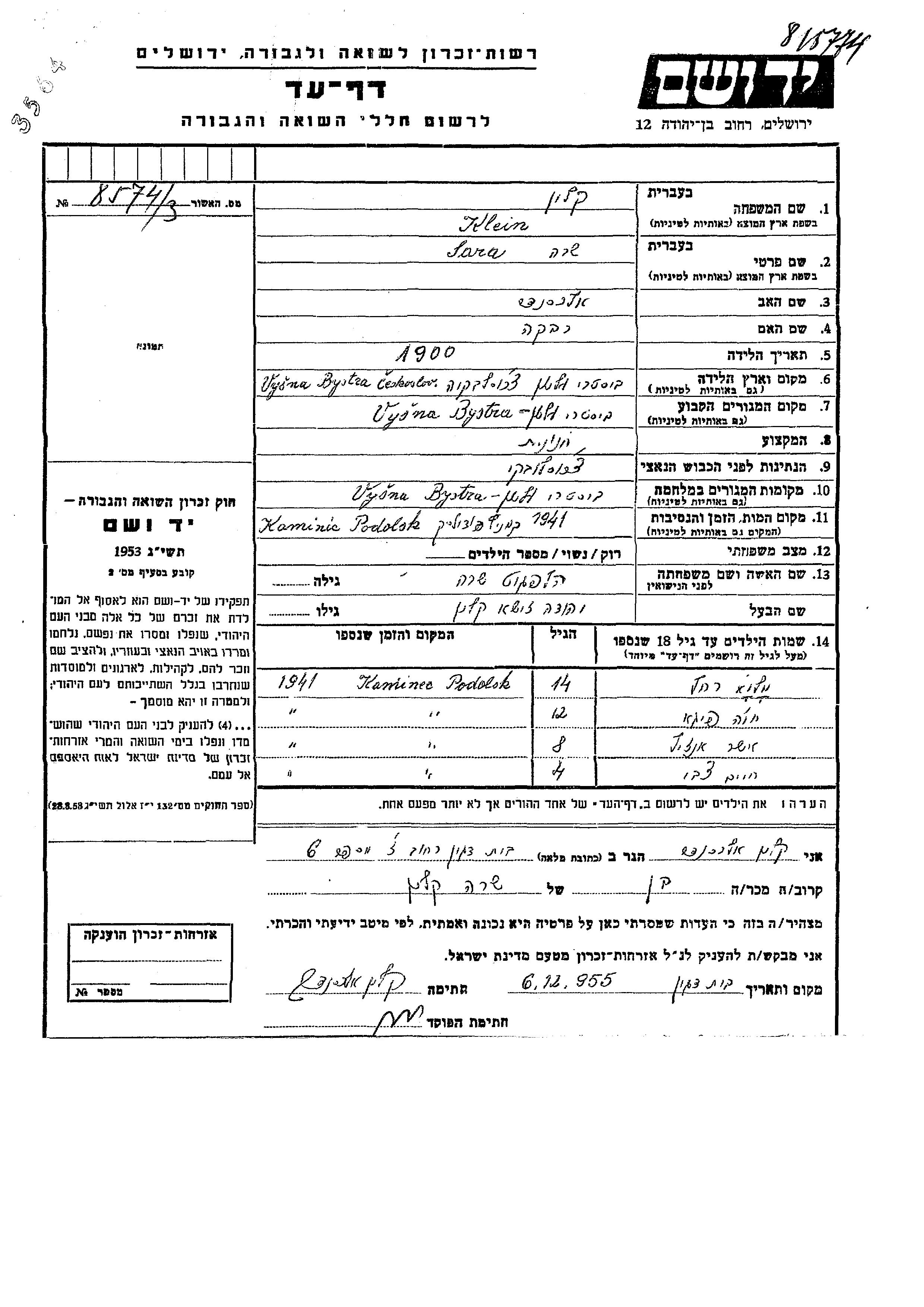 Sara Klein Kalin, geb. Helfgot wurde im Jahr 1900 in Bystra, Tschechoslowakei geboren. Sie war die Tochter von Aleksander und Rivka. Sie war Lebensmittelhändler/-in und mit Yehuda Zisha Verheiratet. Vor dem Zweiten Weltkrieg lebte sie in Bystra, Tschechoslowakei. Während des Krieges war sie in Bystra, Tschechoslowakei.
