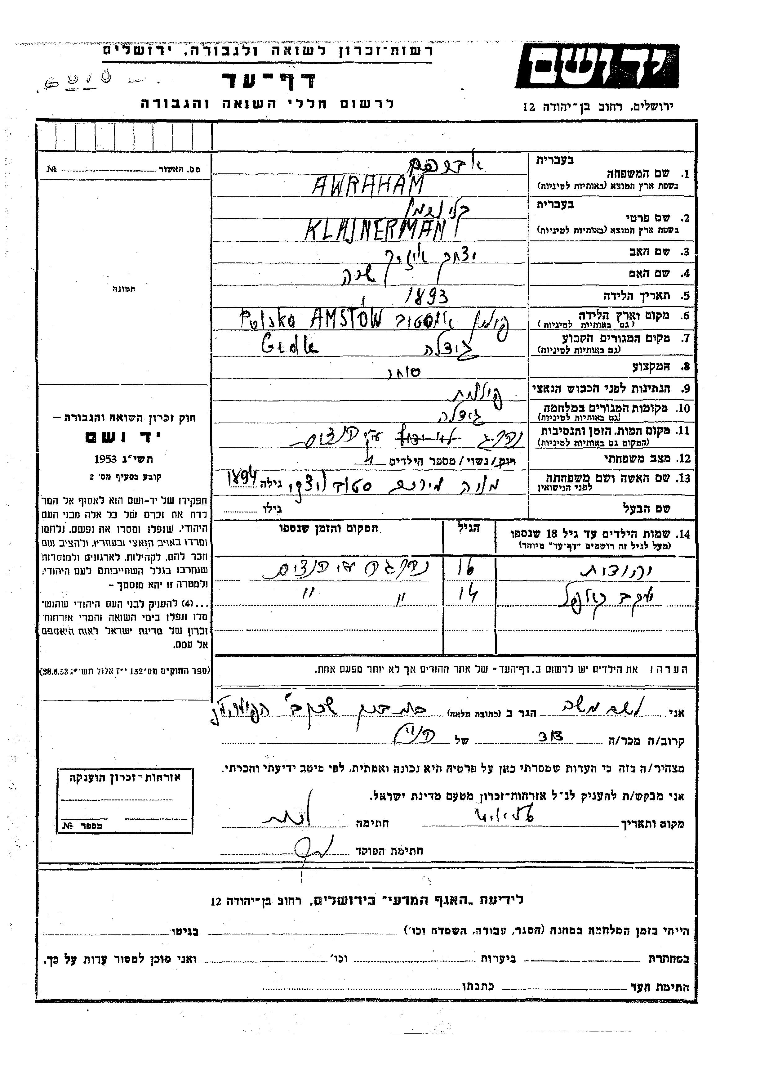 Awraham Klajnerman wurde im Jahr 1893 in Amstow, Polen geboren. Er war der Sohn von Yitzkhak und Sara. Er war Kaufmann/-frau und mit Mania Miriam, geb. Stobvitzki Verheiratet. Vor dem Zweiten Weltkrieg lebte er in Gidle, Polen. Während des Krieges war er in Gidle, Polen.