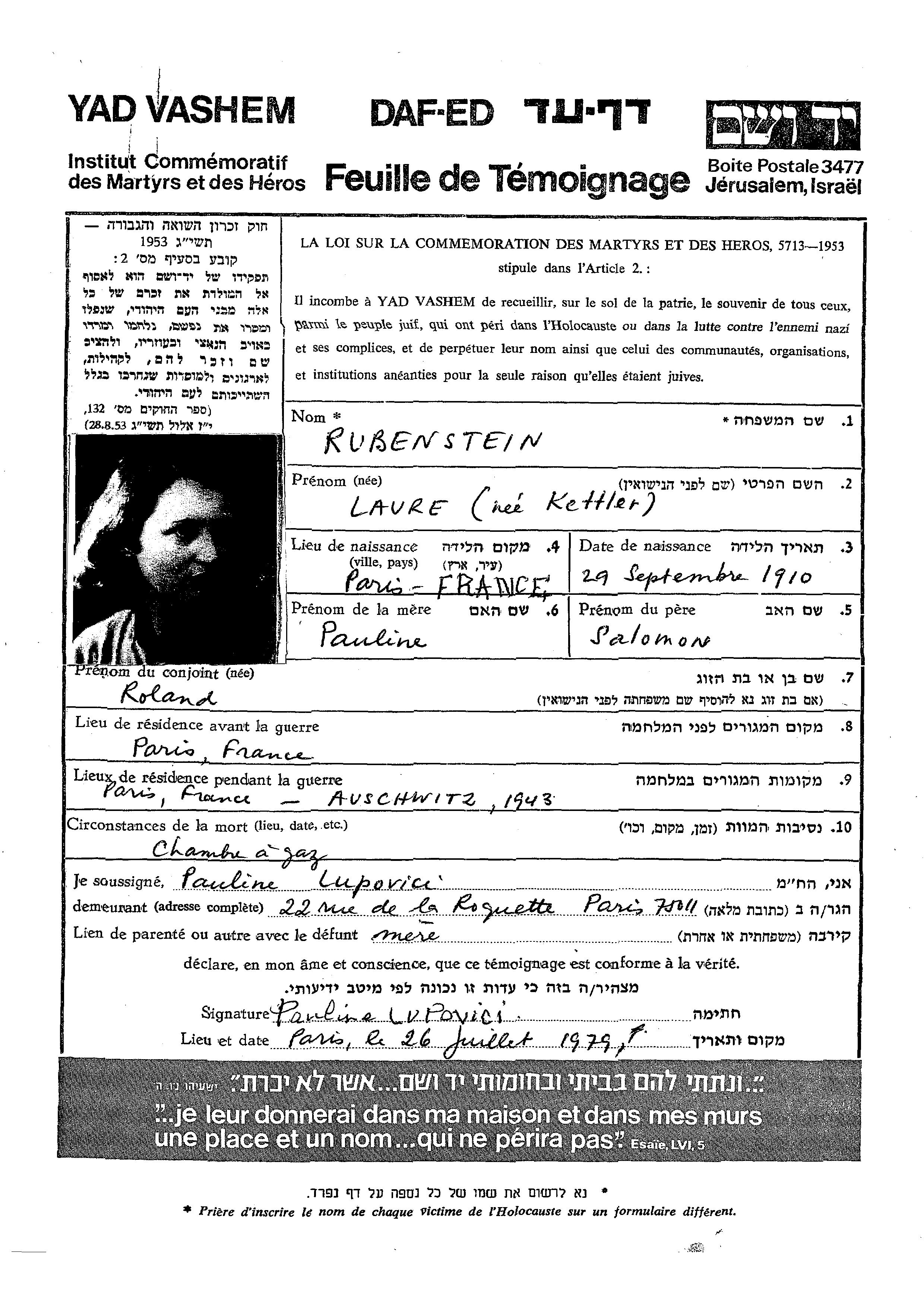 Laura Rubenstein, geb. Kettler wurde im Jahr 1910 in Paris, Frankreich geboren. Sie war die Tochter von Salomon und Pauline. Vor dem Zweiten Weltkrieg lebte sie in Paris, Frankreich. Während des Krieges war sie in Auschwitz, Polen.