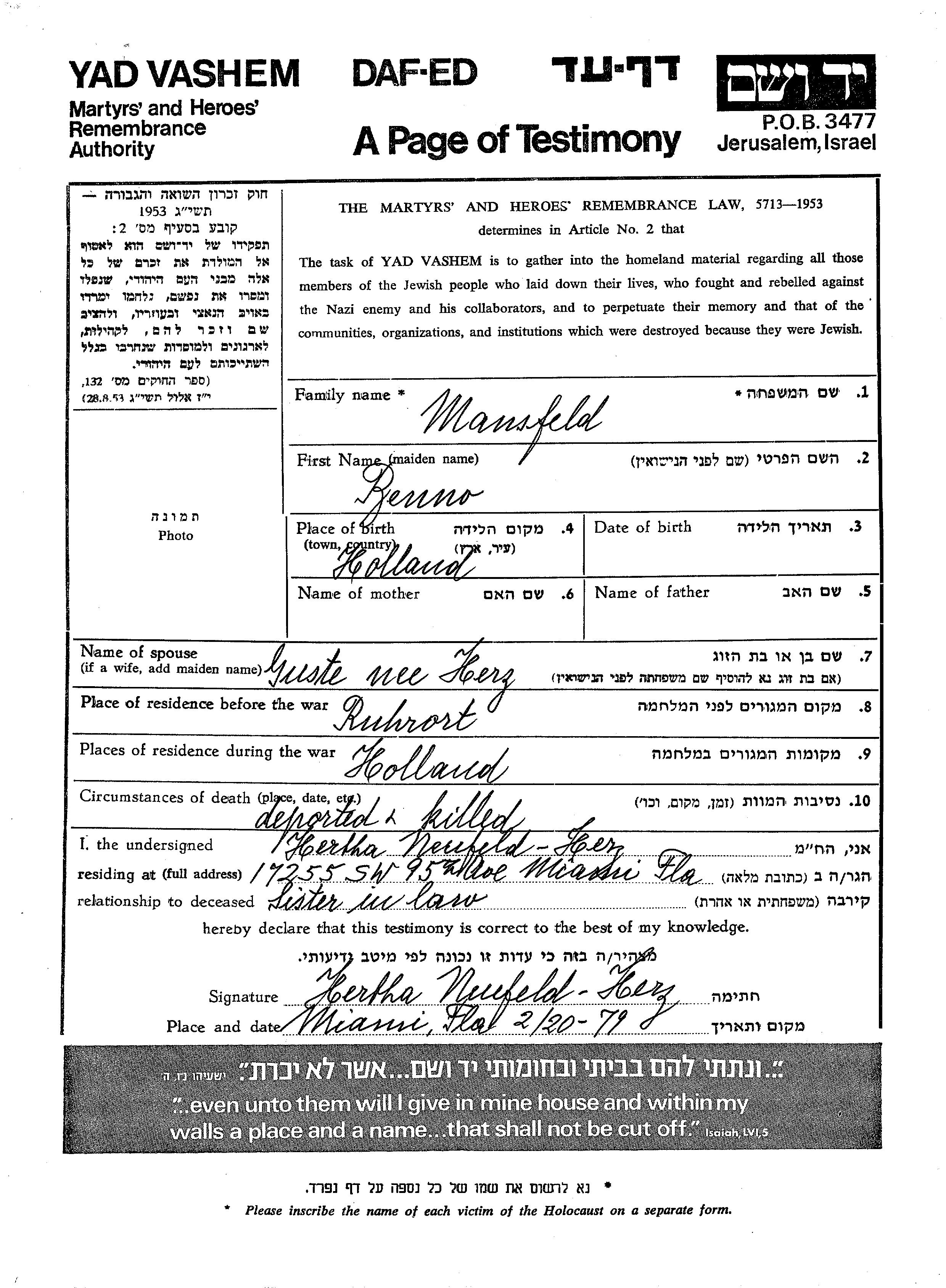 Benno Mansfeld wurde in Niederlande geboren. Er war mit Guste, geb. Herz Verheiratet. Vor dem Zweiten Weltkrieg lebte er in Ruhrort, Deutsches Reich. Während des Krieges war er in Niederlande.