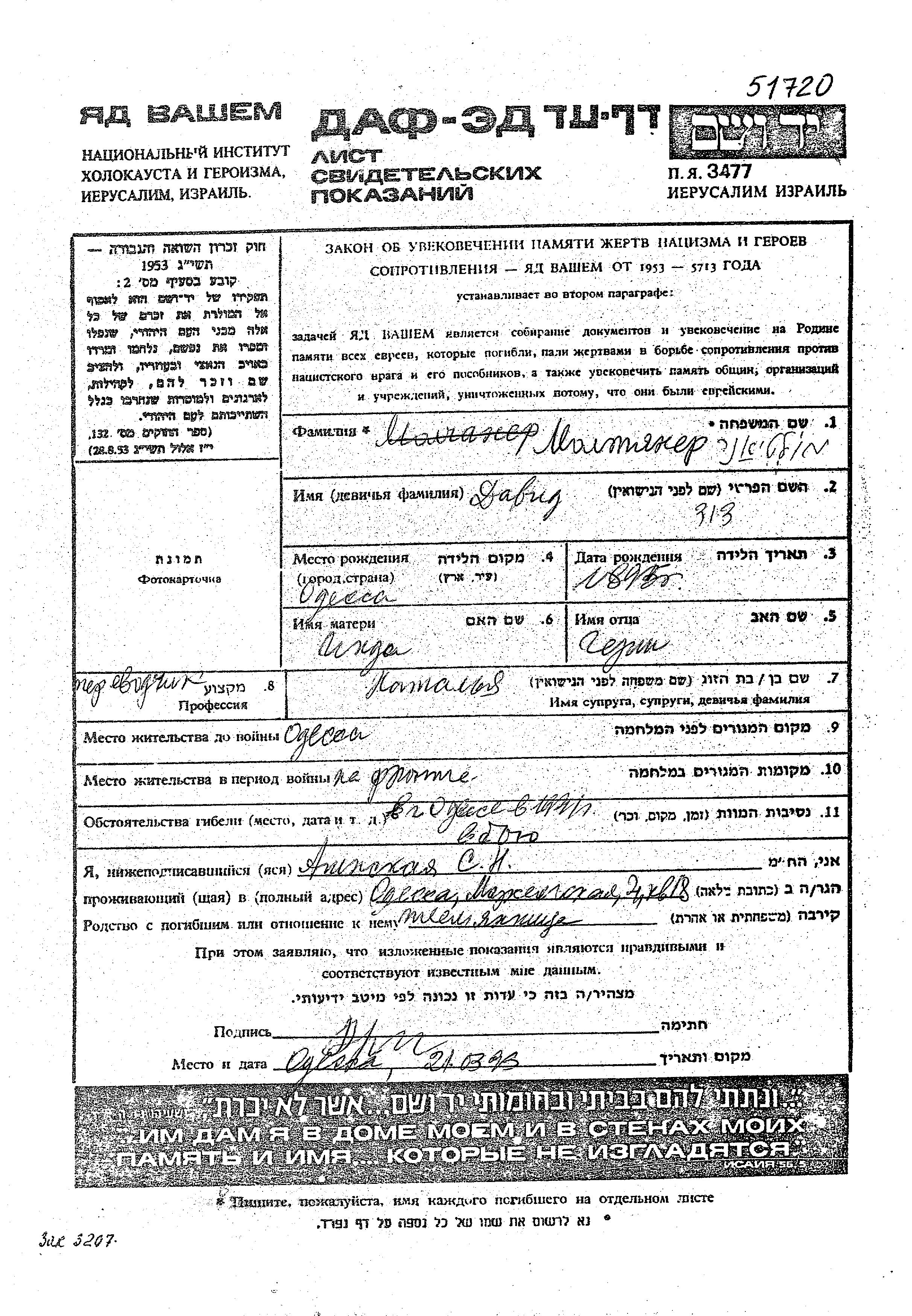 Moltyaner David 1895 Odessa, Ukraine (UdSSR) Verfolgtenliste