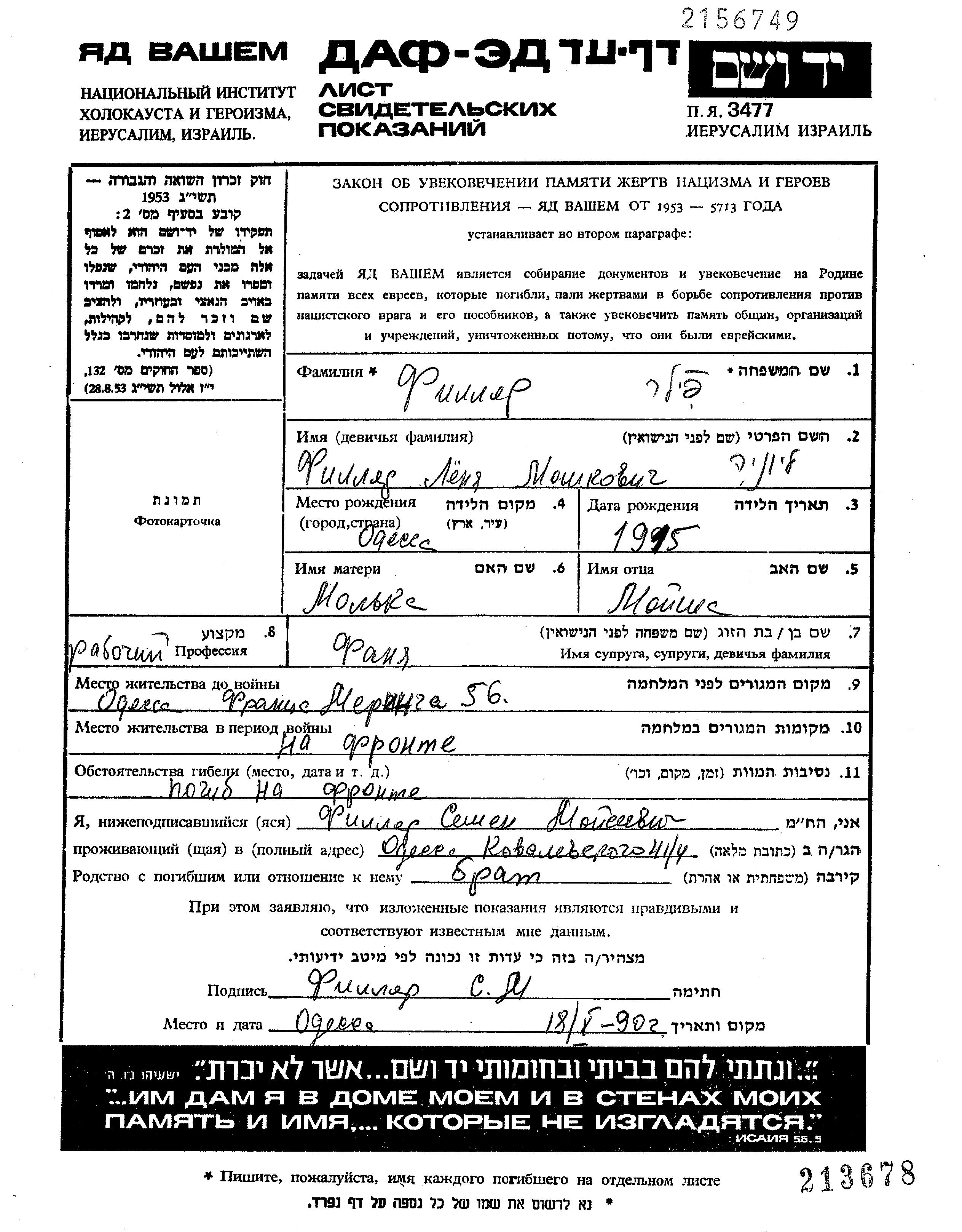 Filler | Lenya | 1915 | Odessa, Ukraine (UdSSR) | Verfolgtenliste |