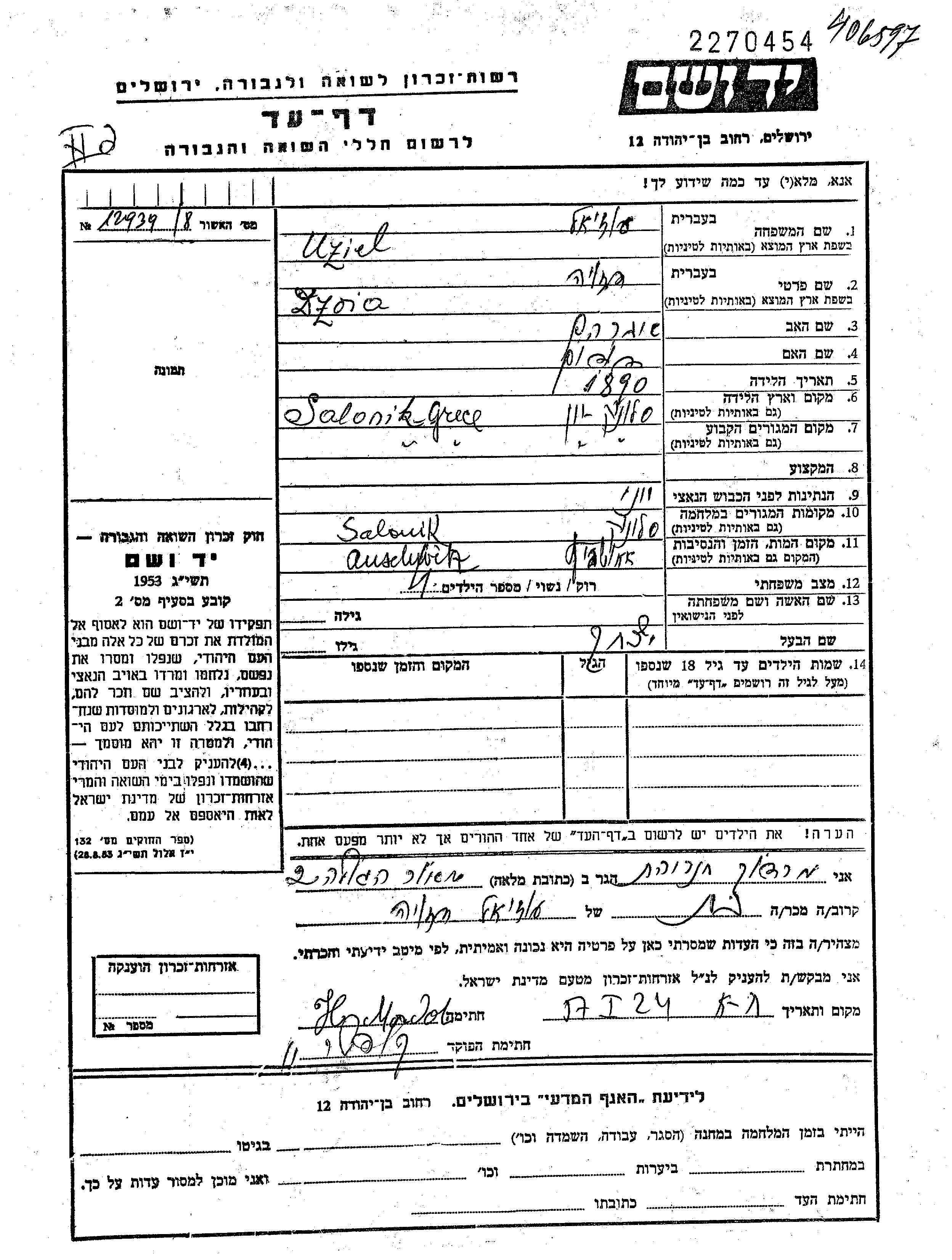 Dzoia Uziel, geb. Sevi wurde im Jahr 1890 in Saloniki, Griechenland geboren. Vor dem Zweiten Weltkrieg lebte sie in Thessaloniki, Griechenland.