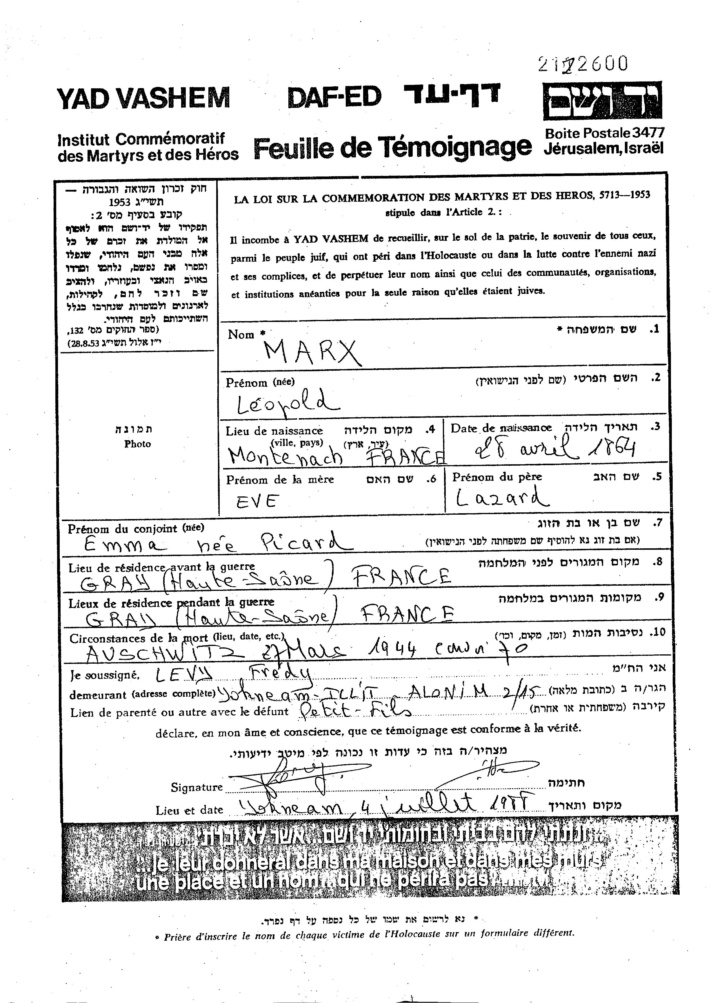 Leopold Marx wurde im Jahr 1864 in Montenach, Frankreich geboren. Vor dem Zweiten Weltkrieg lebte er in Gray, Frankreich.