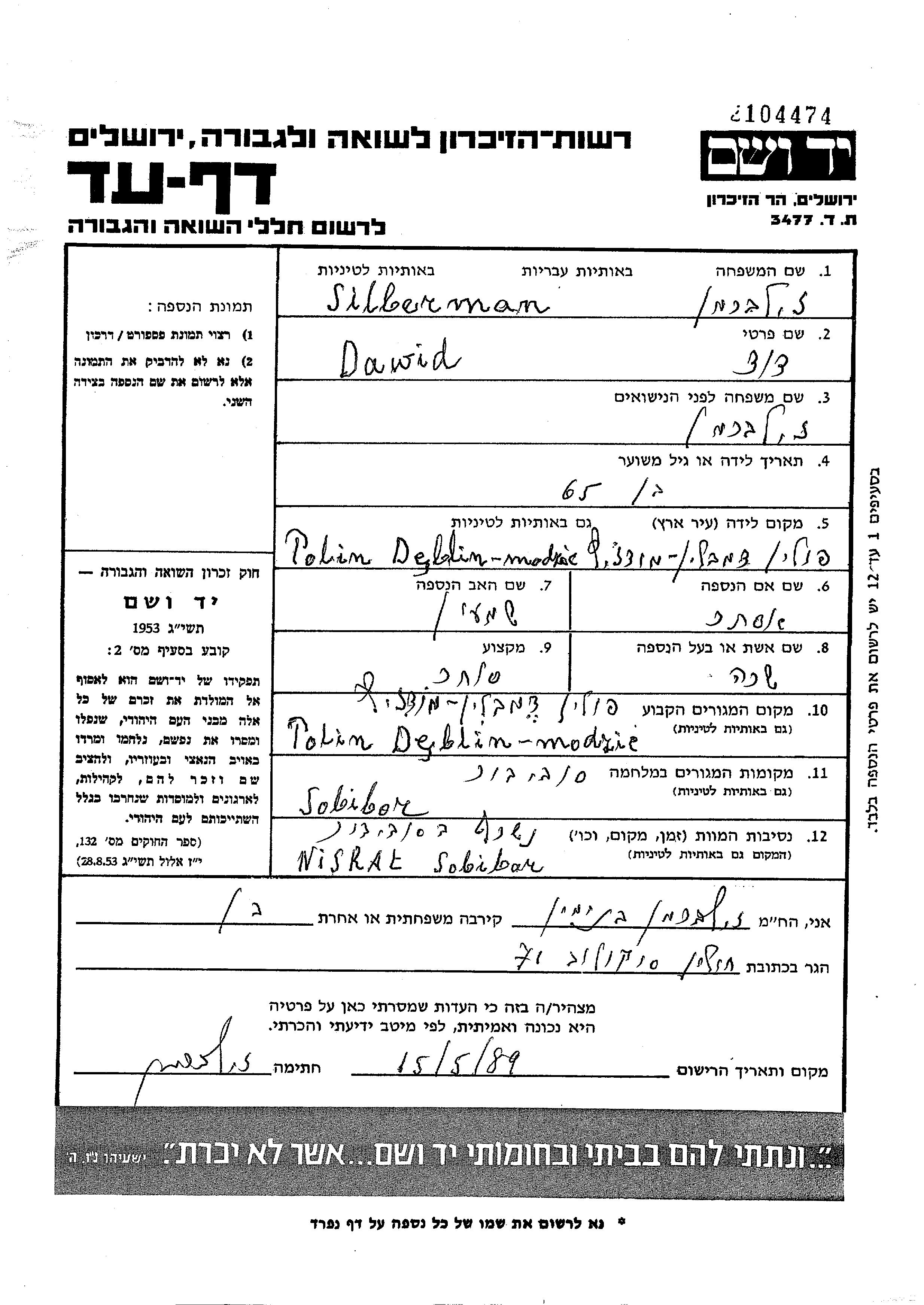 Silberman Dawid Deblin, Polen Gedenkblatt