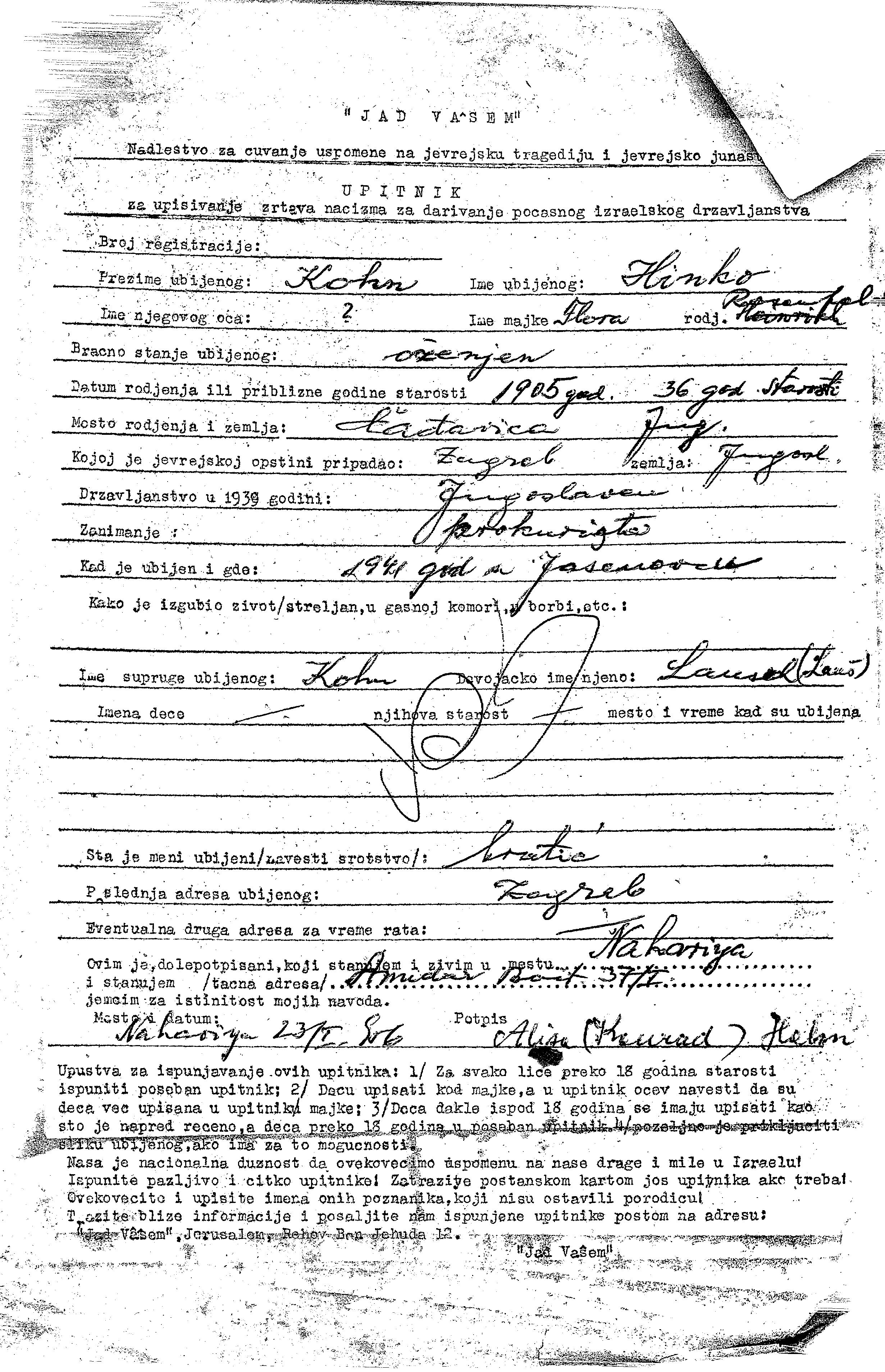 Hinko wurde in der Schoah ermordet. Todesort: Jasenovac, Jugoslawien im Jahr 1941.