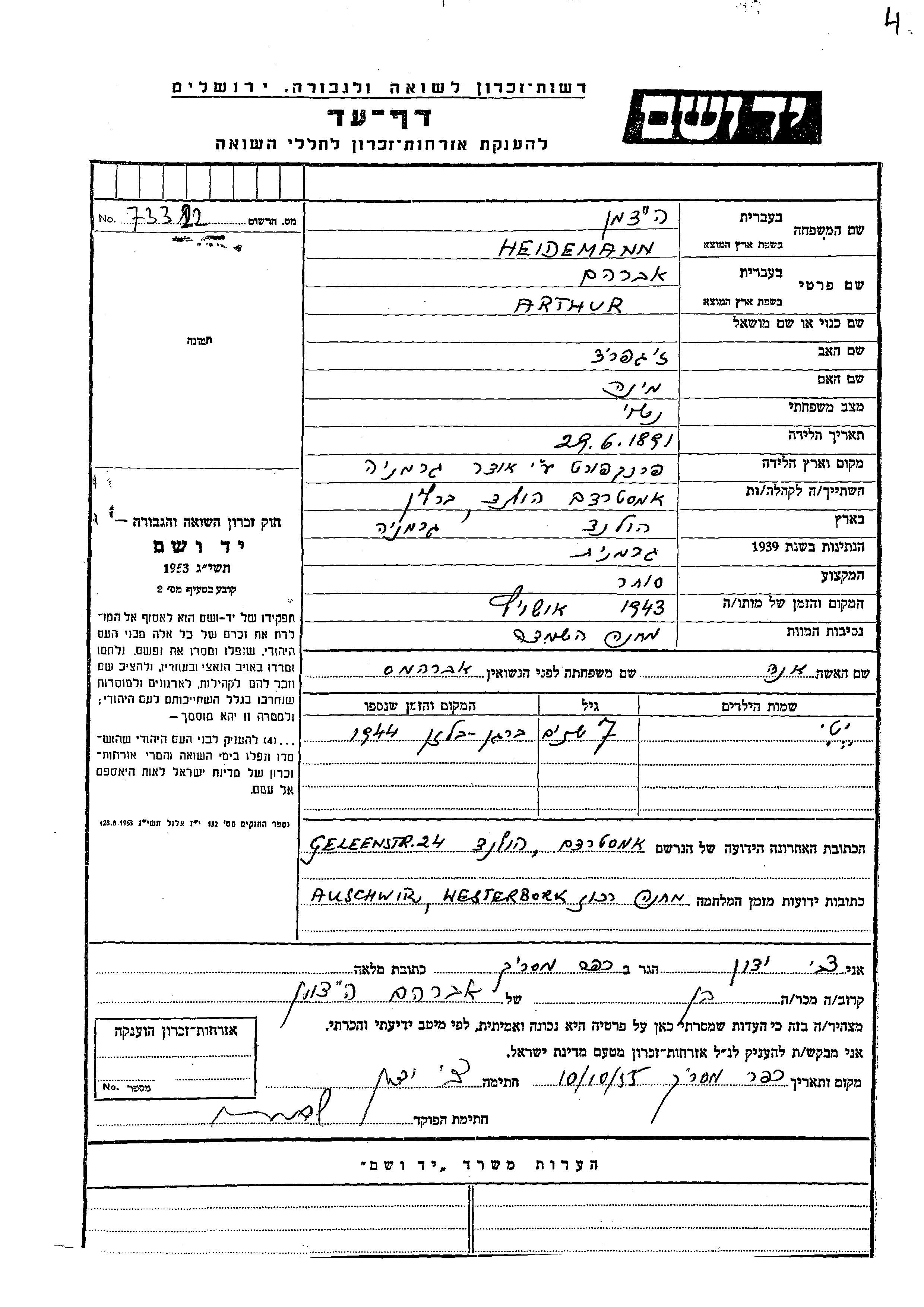 Heidemann Yehudit Amsterdam, Niederlande Gedenkblatt