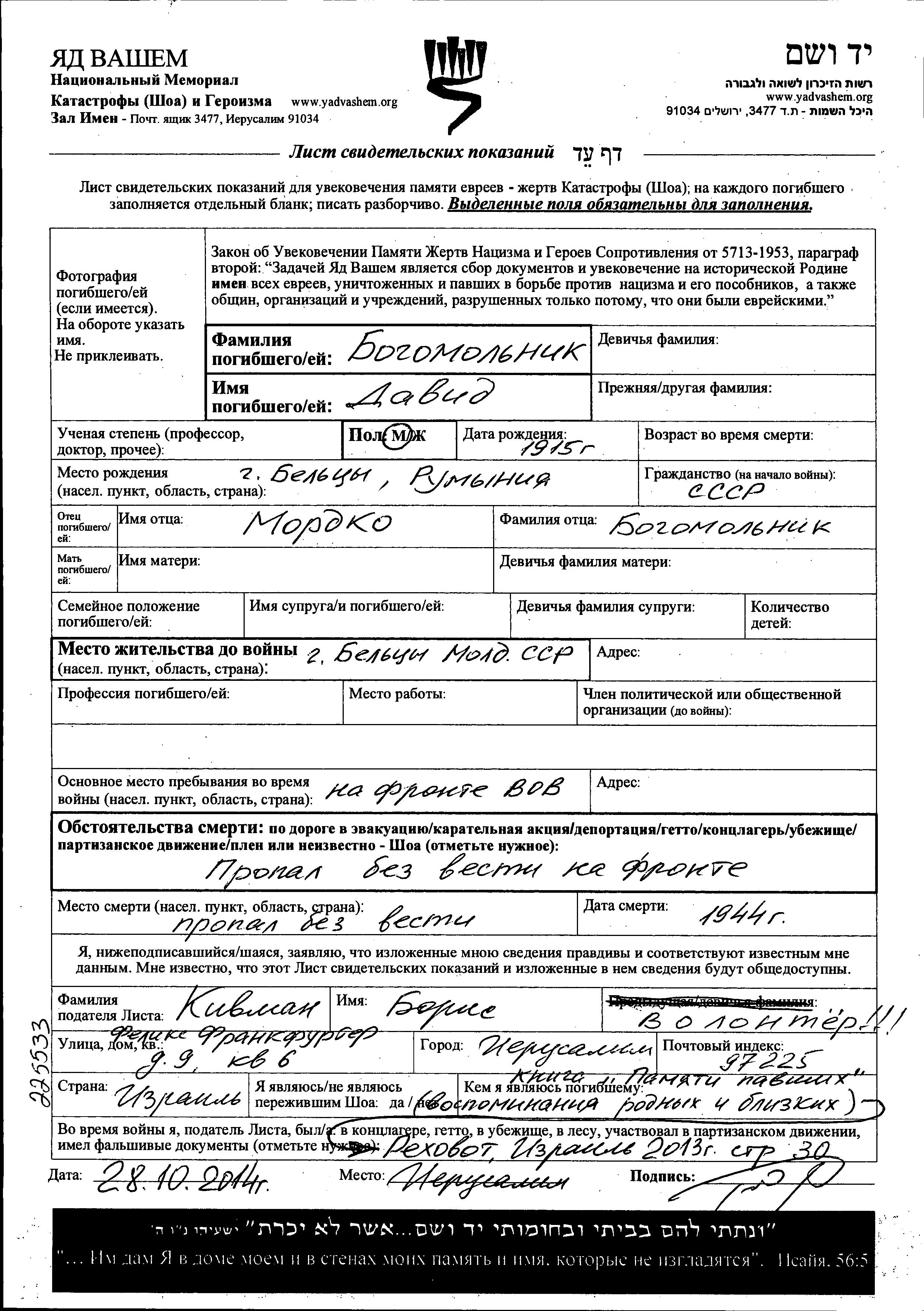David Bogomolnik wurde im Jahr 1915 in Balti, Rumänien geboren. Vor dem Zweiten Weltkrieg lebte er in Balti, Rumänien.