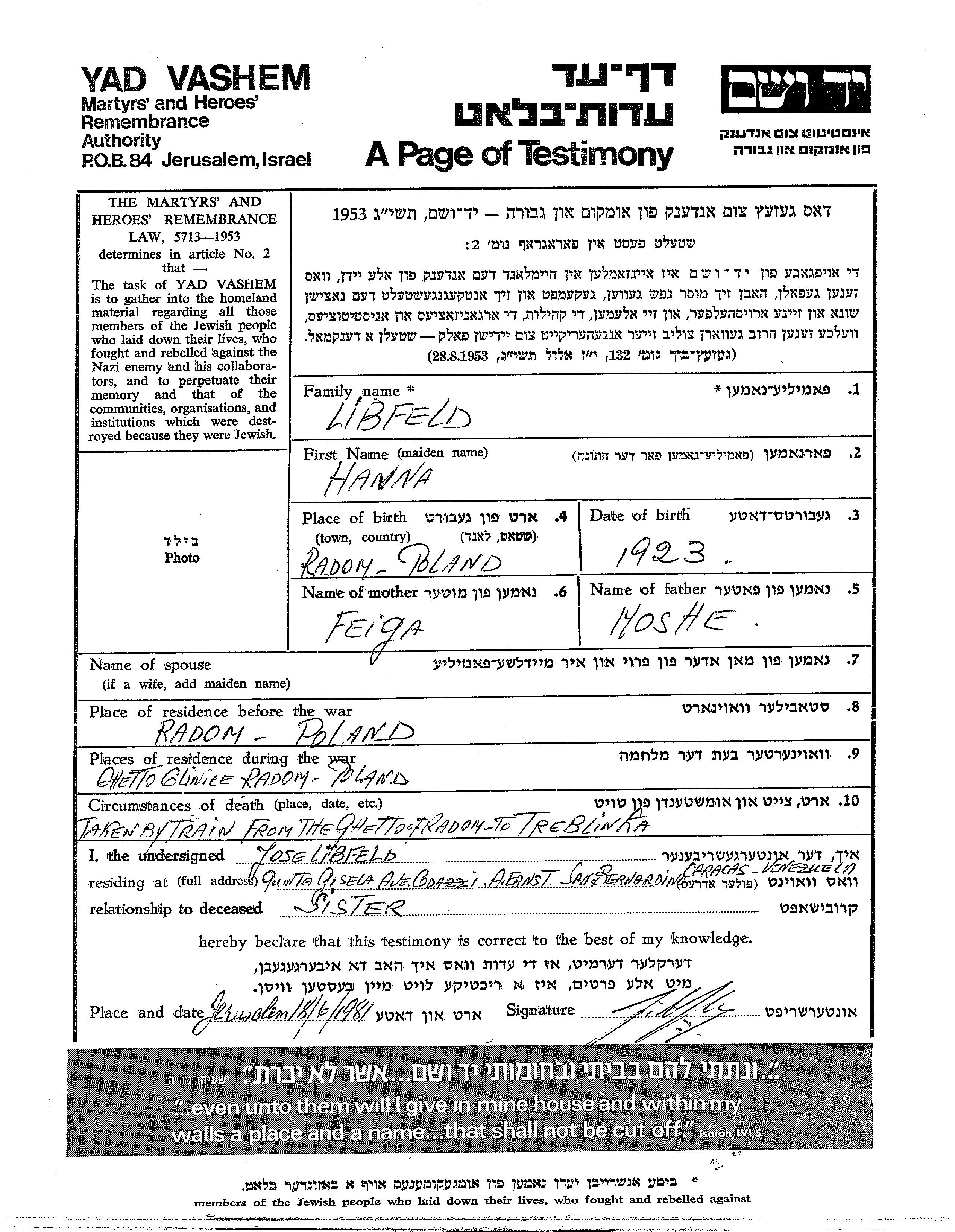 Hanna Libfeld wurde im Jahr 1923 in Radom, Polen geboren. Vor dem Zweiten Weltkrieg lebte sie in Radom, Polen.