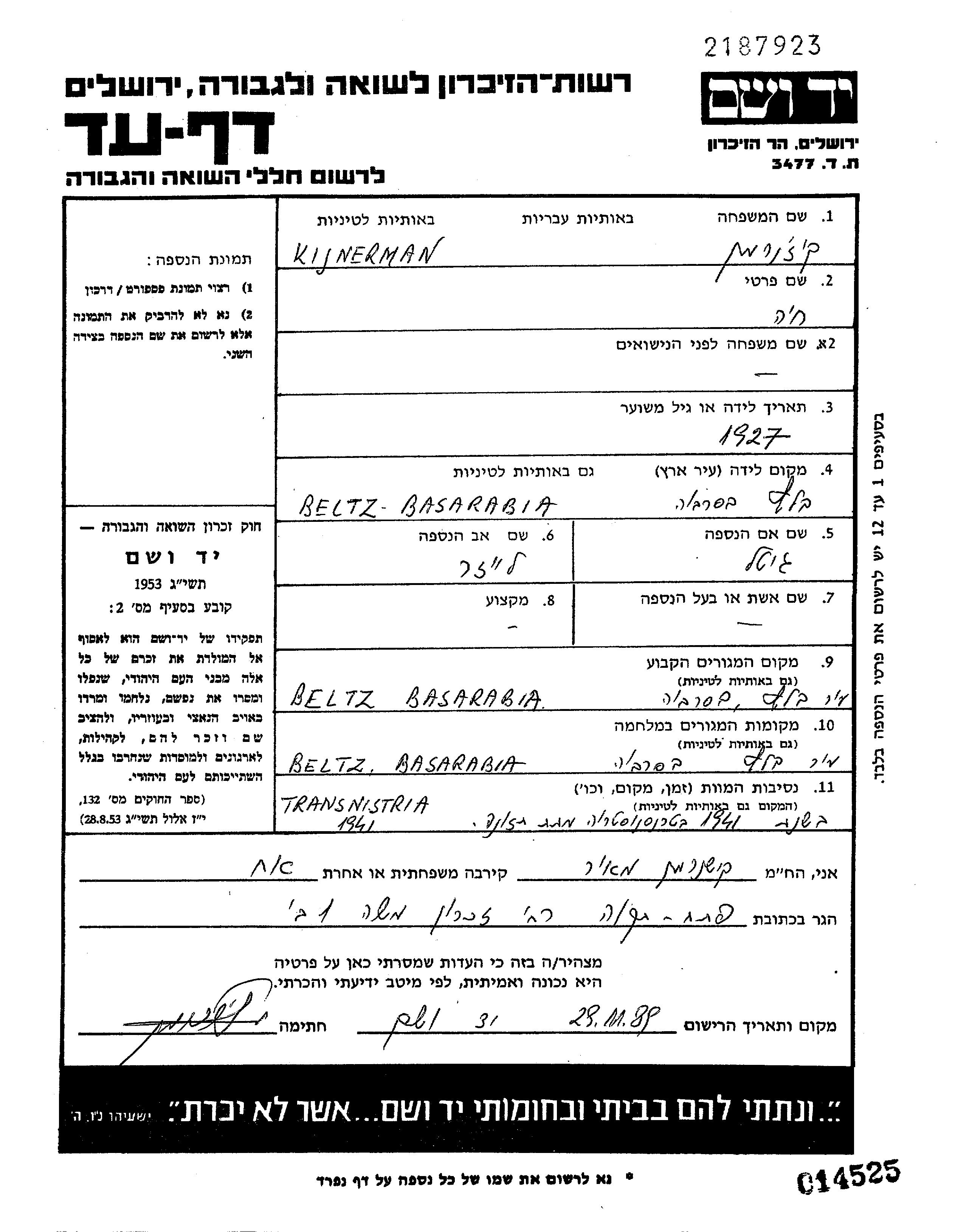 Khaia Kijnerman wurde im Jahr 1927 in Balti, Rumänien geboren. Vor dem Zweiten Weltkrieg lebte sie in Balti, Rumänien.