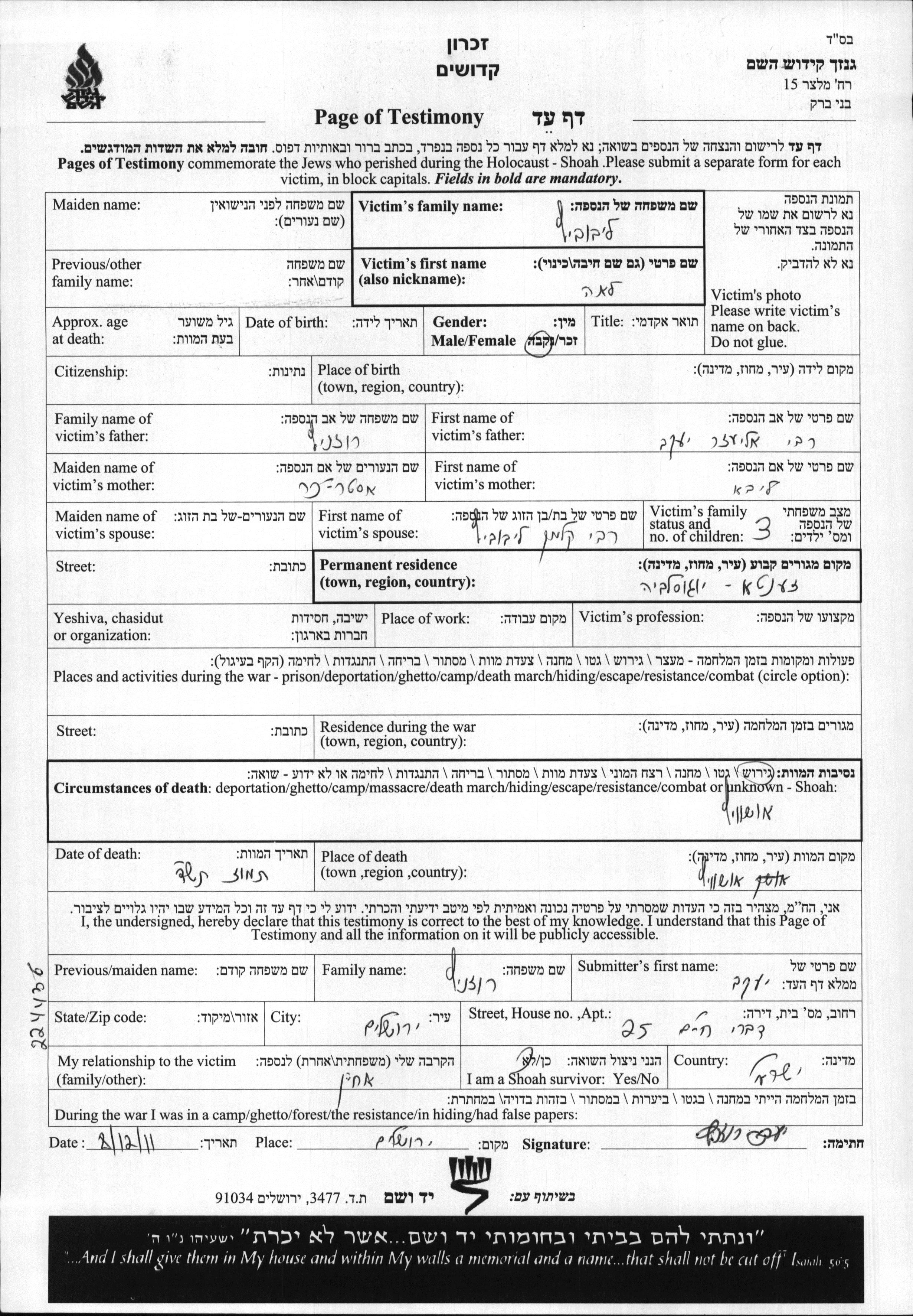 Leibovitz Lea Zenta, Jugoslawien Aufzeichnungen ueber ermordete Personen