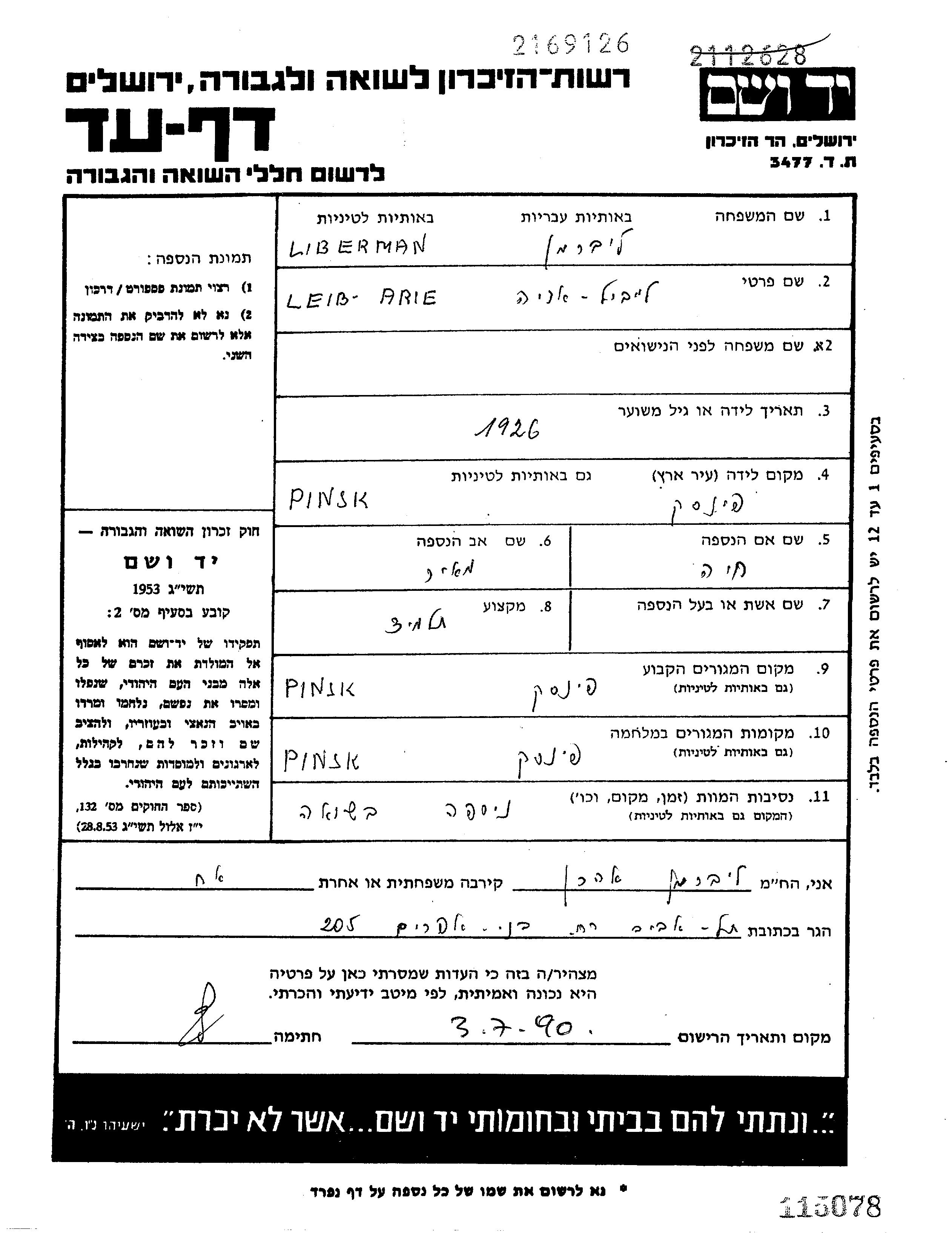 Leib Arie Liberman wurde im Jahr 1926 in Pinsk, Polen geboren. Er war Schüler/-in. Vor dem Zweiten Weltkrieg lebte er in Pinsk, Polen.