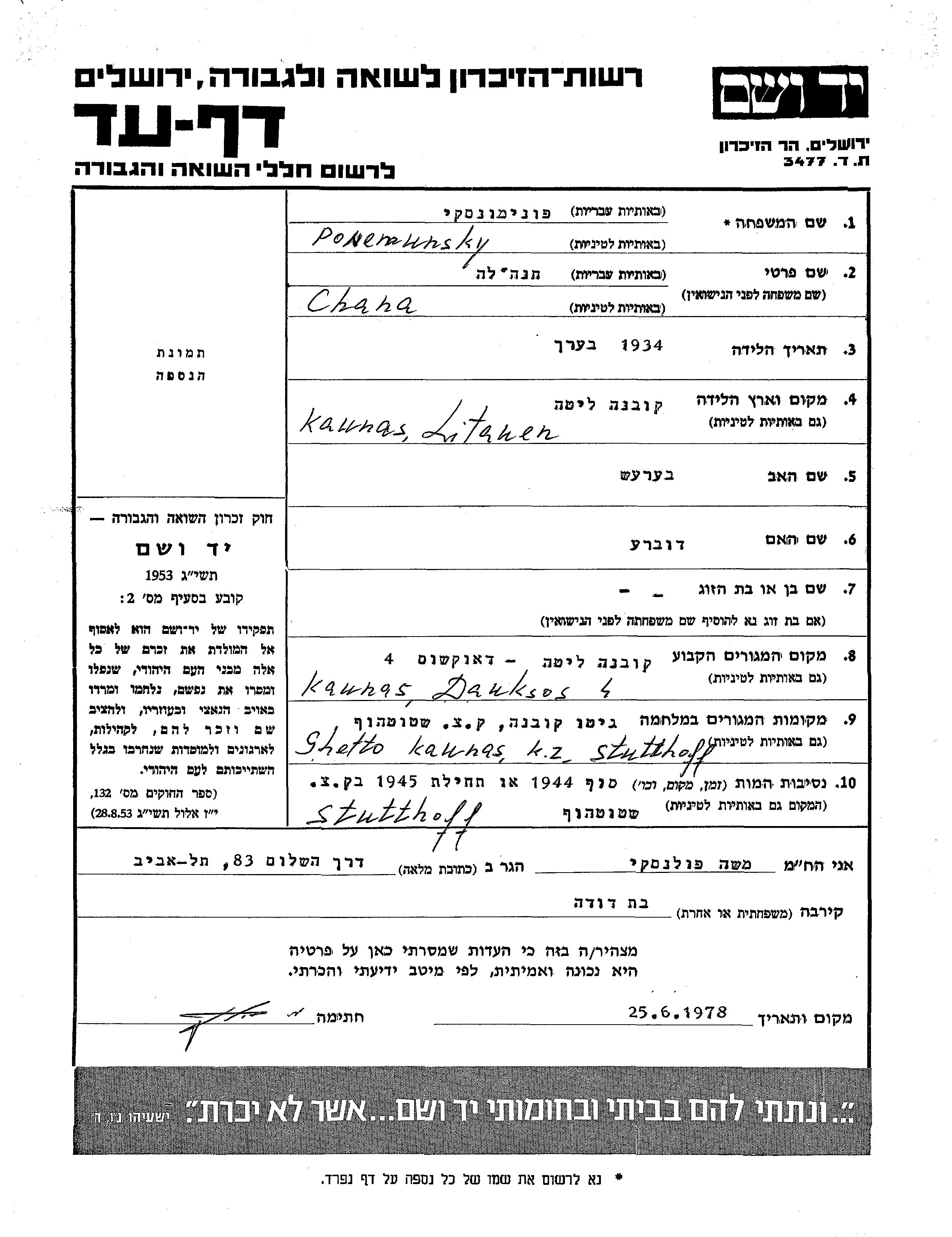 Chana Ponemunsky wurde im Jahr 1934 in Kaunas, Litauen geboren. Vor dem Zweiten Weltkrieg lebte sie in Kaunas, Litauen.