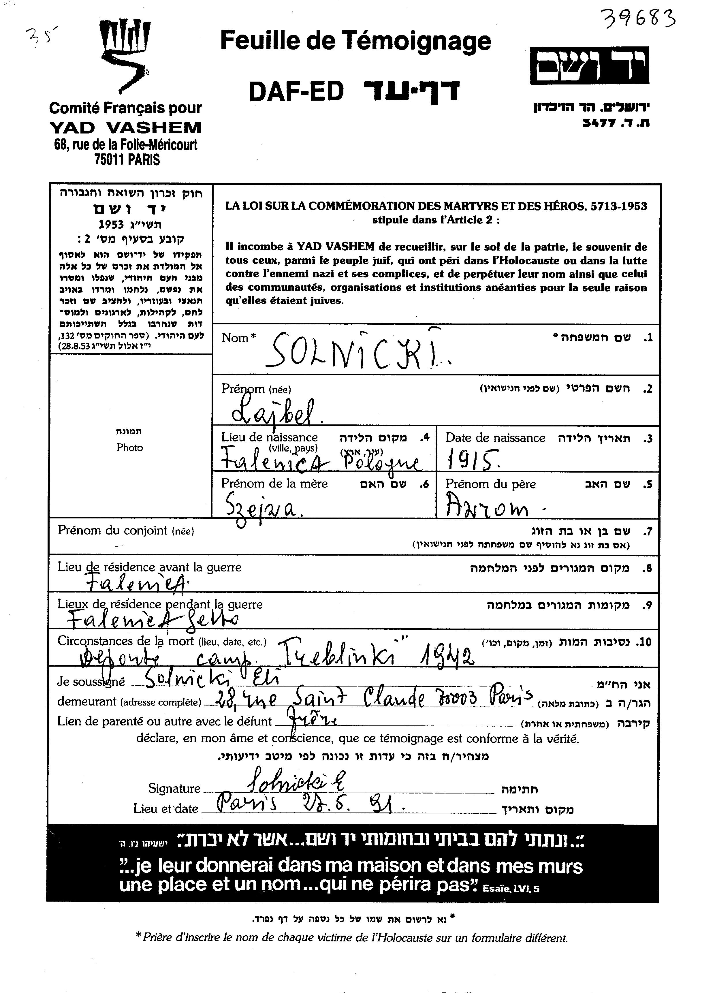 Lajbel Solnicki wurde im Jahr 1915 in Falenica, Polen geboren. Vor dem Zweiten Weltkrieg lebte er in Falenica, Polen.