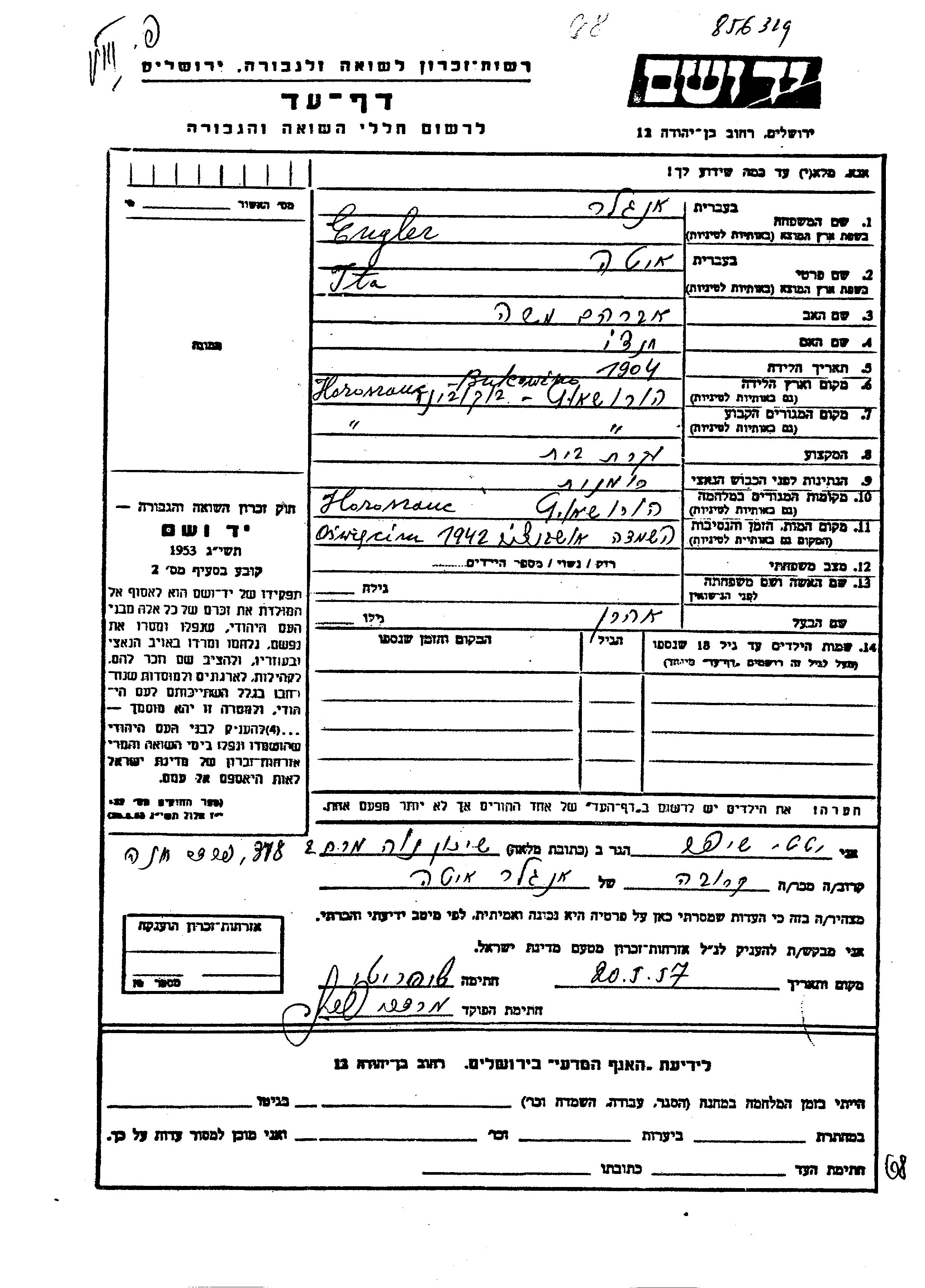 Iuta Engler wurde im Jahr 1904 in Horosauti, Rumänien geboren. Sie war Hausfrau. Vor dem Zweiten Weltkrieg lebte sie in Horosauti, Rumänien.